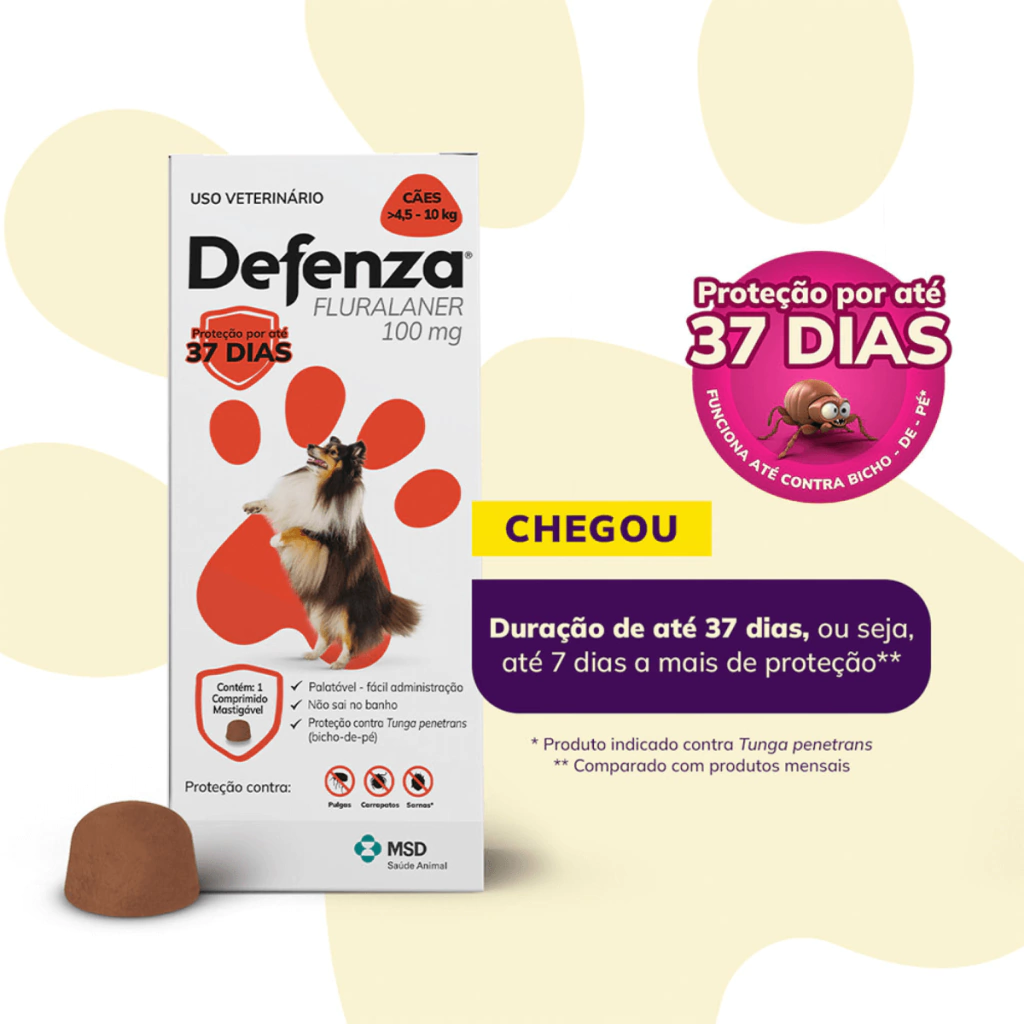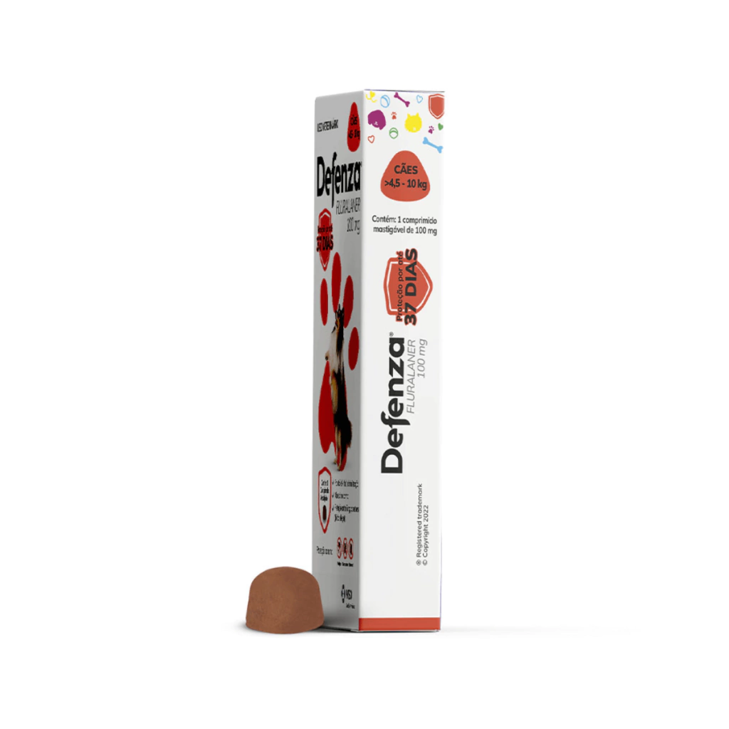 O Defenza Antipulgas e Carrapatos para Cães Cães de 4,5 a 10 kg é um medicamento diferenciado, pois além de ser eficaz no combate a pulgas, carrapatos e sarnas, também protege contra Tunga penetrans, o bicho-de-pé, uma zoonose que pode acometer animais e humanos. E melhor ainda, possui o maior tempo de ação entre as soluções mensais, durando até 37 dias.