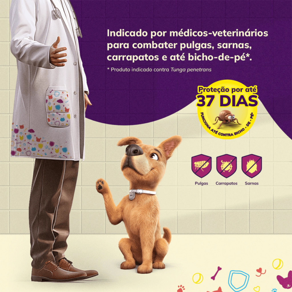 O Defenza Antipulgas e Carrapatos para Cães Cães de 10 a 20 kg é um medicamento diferenciado, pois além de ser eficaz no combate a pulgas, carrapatos e sarnas, também protege contra Tunga penetrans, o bicho-de-pé, uma zoonose que pode acometer animais e humanos. E melhor ainda, possui o maior tempo de ação entre as soluções mensais, durando até 37 dias.