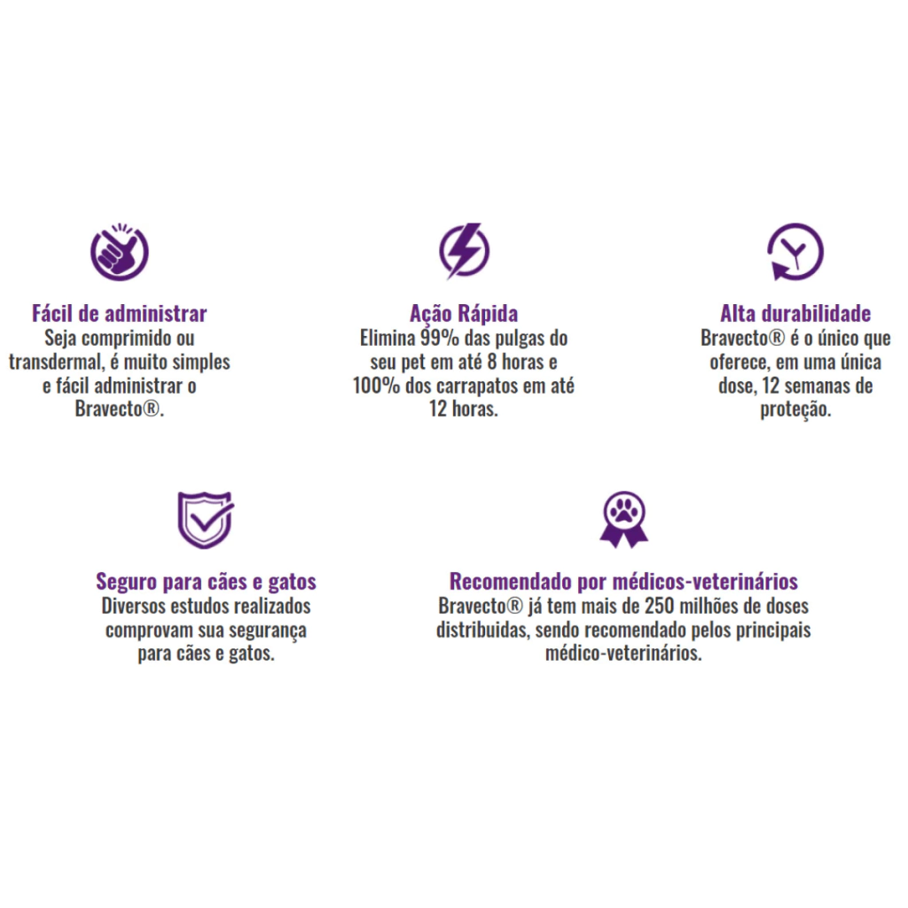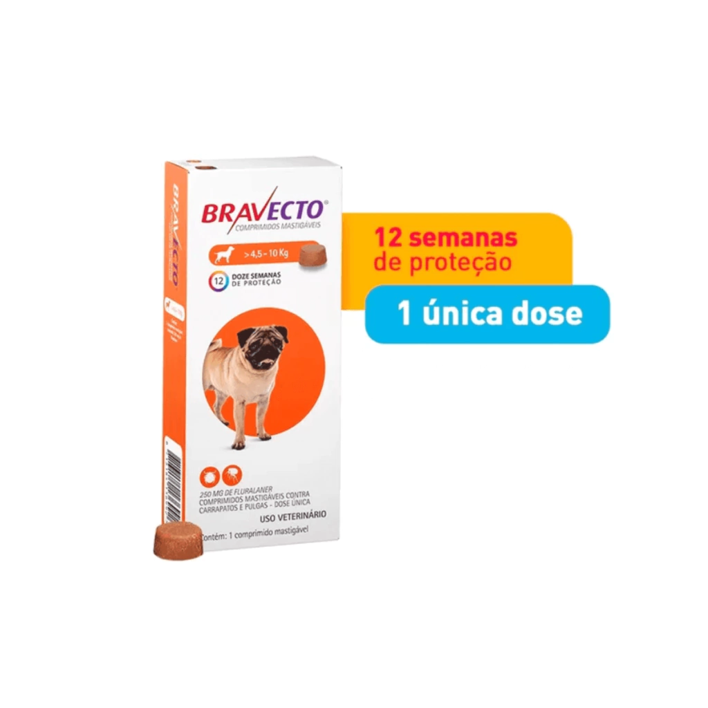 Bravecto é indicado para o tratamento de infestações por carrapatos e pulgas em cães, proporcionando 12 semanas de proteção. Bravecto é um inseticida e acaricida, sistêmico com longa duração de ação, que promove eficácia imediata e persistente por 12 semanas contra carrapatos e pulgas. Os carrapatos e pulgas devem estar aderidos ao cão, e já tendo iniciada a alimentação para serem expostos ao princípio ativo.