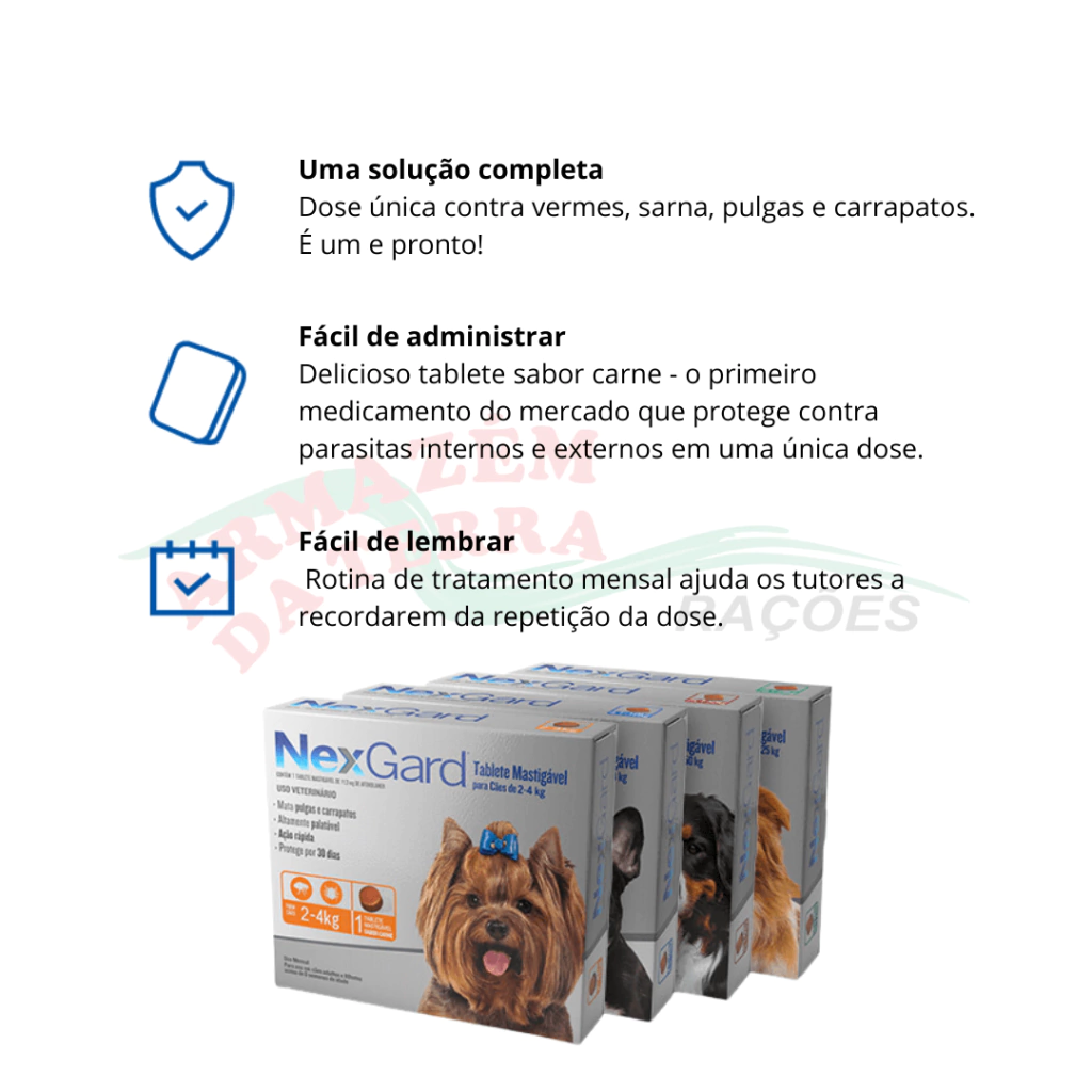 Controla rapidamente a reinfestação de pulgas adultas recém-adquiridas e carrapatos por um mês.
