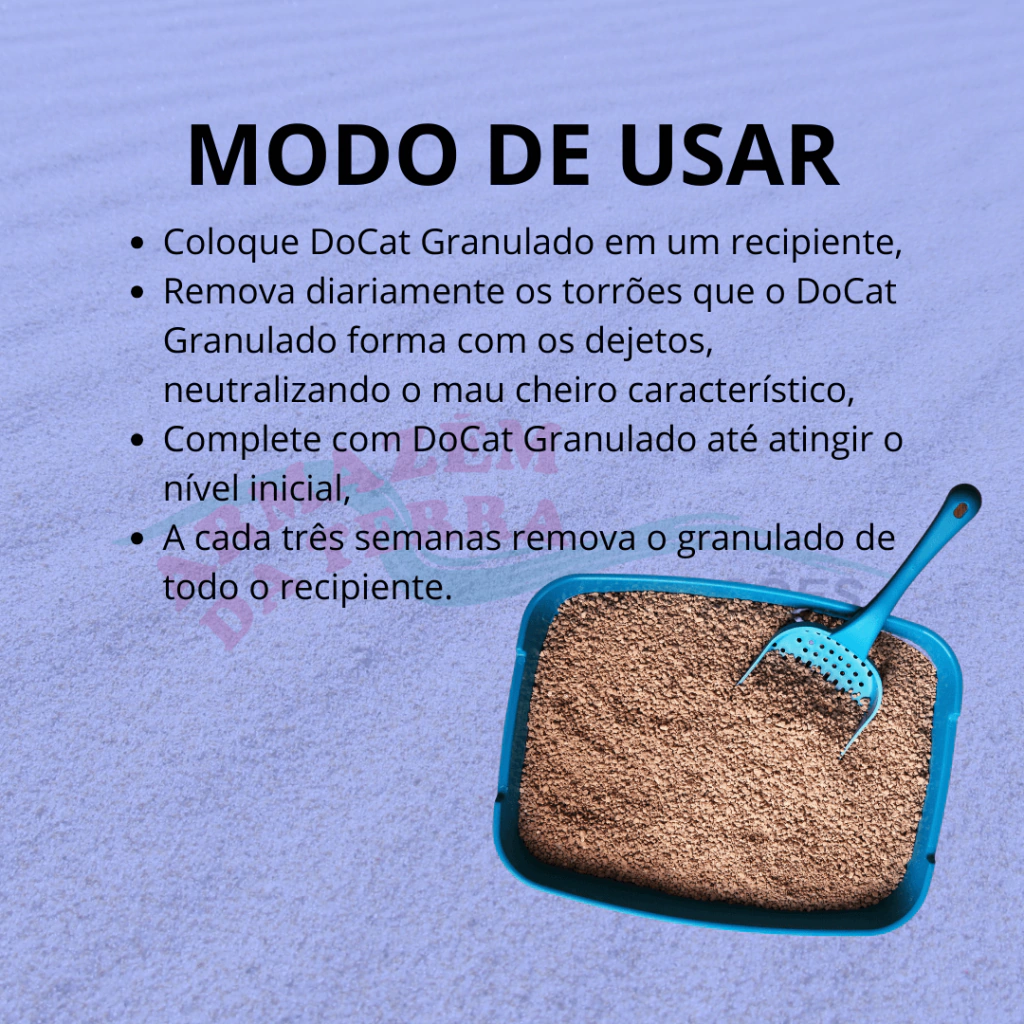 Remova diariamente os torrões que o DoCat Granulado forma com os dejetos, neutralizando o mau cheiro característico,