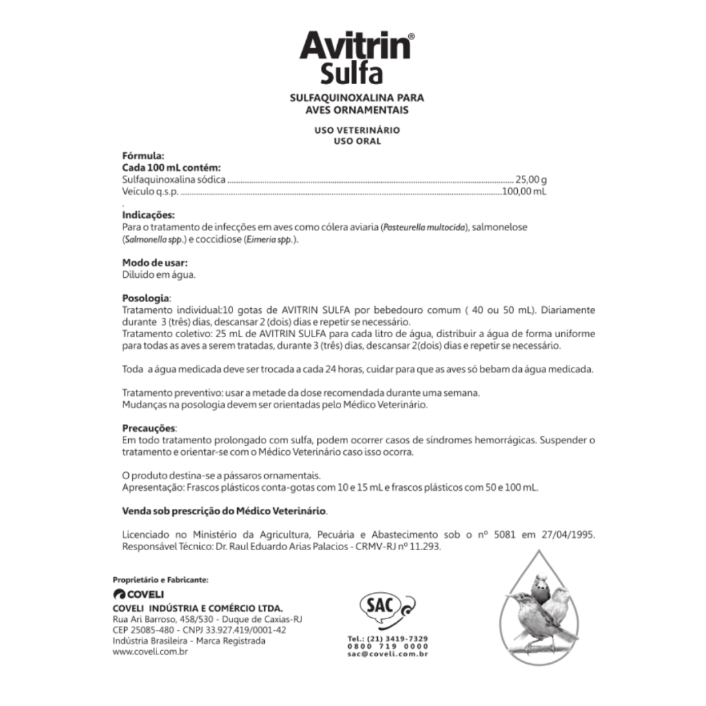 Avitrin Sulfa é um medicamento indicado para o tratamento de coccidiose, salmonelose e cólera aviária em pássaros e aves ornamentais. Sua ação eficaz combate infecções intestinais e diarreias causadas por agentes bacterianos, ajudando na recuperação rápida e na saúde do sistema digestivo das aves.
