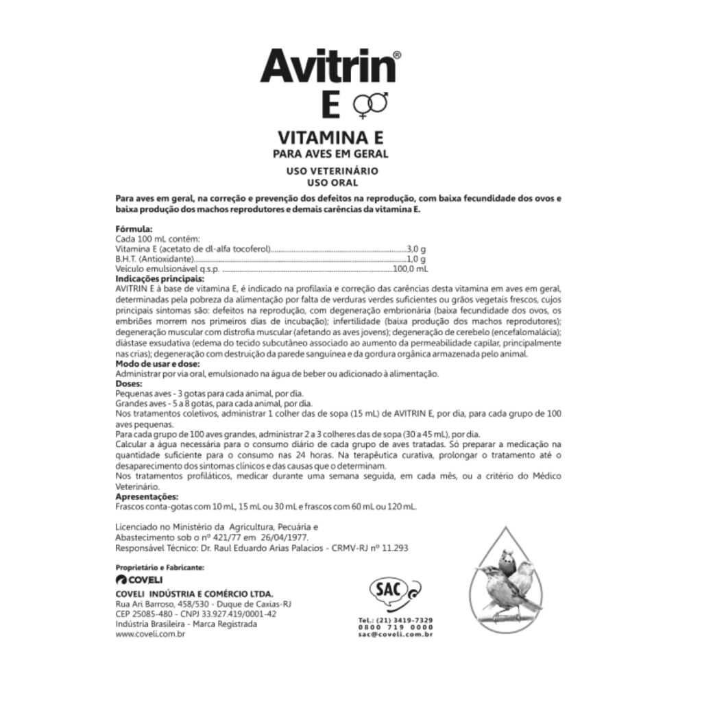 Avitrin E é um suplemento formulado para aumentar a reprodutividade de pássaros – machos e fêmeas – e aves ornamentais, elevando a taxa de fertilidade em cerca de 30%. Além disso, fortalece os embriões, promovendo um desenvolvimento saudável dos ovos. Sua composição com Vitamina E também auxilia no estímulo do sistema imunológico, podendo ser administrado durante todo o ano para manter a saúde das aves.