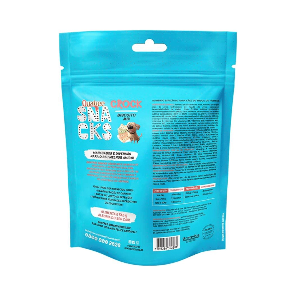 Detalhes: O Biscoito Quatree Snacks Crock Mix para Cães Adultos é a escolha ideal para quem quer oferecer sabor e nutrição ao seu cão. Sua textura crocante e ingredientes cuidadosamente selecionados proporcionam uma experiência irresistível para o paladar do seu amigo de quatro patas. Além de satisfazer o apetite, o biscoito é enriquecido com vitaminas e minerais essenciais, ajudando a fortalecer a saúde geral do seu cão de maneira deliciosa. Perfeito para ser oferecido como lanche, em momentos de carinho ou como recompensa durante atividades recreativas e educativas.