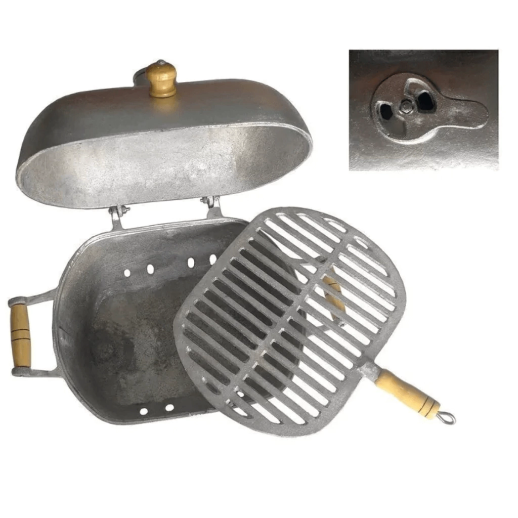 Material: Alumínio fundido (churrasqueira e grelha), com grelha antiaderente