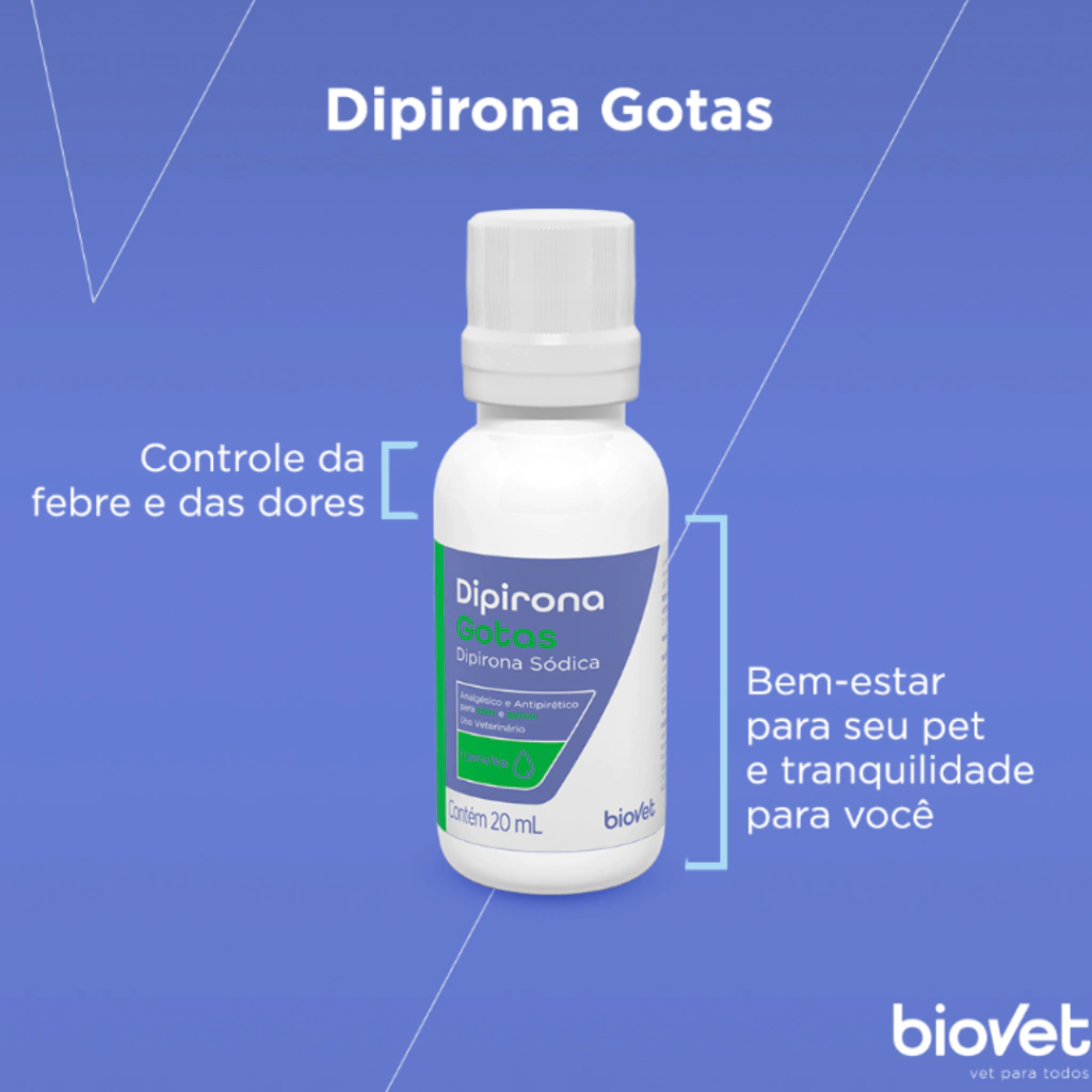 Dipirona Biovet é indicado para cães e gatos, como analgésico e antipirético, nos estados dolorosos agudos ou crônicos e febris, de variadas etiologias.