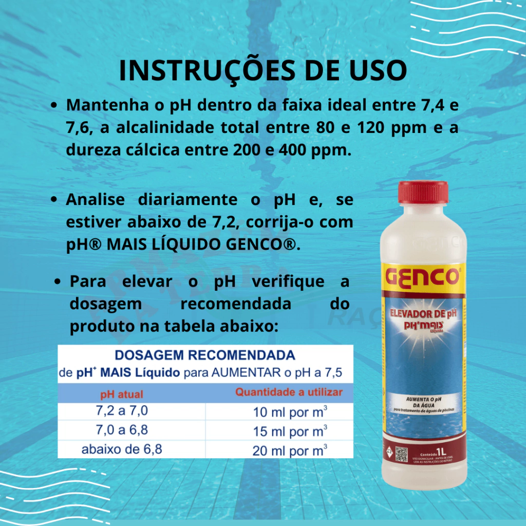 2) Analise diariamente o pH e, se estiver abaixo de 7,2, corrija-o com pH® MAIS LÍQUIDO GENCO®.