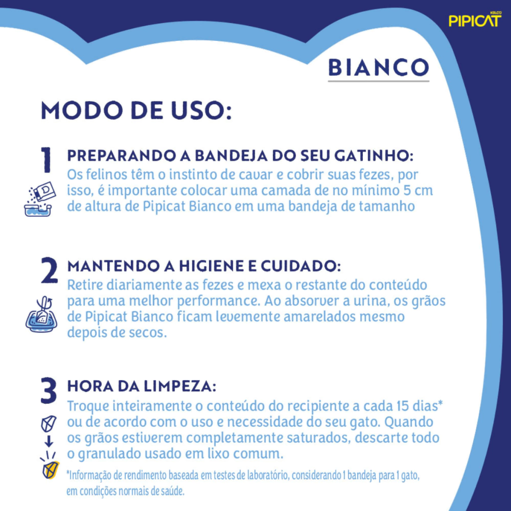 O Granulado Sanitário Pipicat Bianco é a escolha ideal para manter a caixa de areia do seu gato sempre limpa e livre de odores indesejáveis. Com sua fórmula branca e ultraabsorvente, ele retém a urina de forma eficiente, garantindo um ambiente mais higiênico.