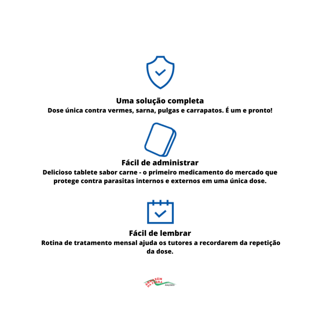 Delicioso: Um tablete sabor carne, altamente palatável e extremamente saboroso para o seu cão. Chega de sofrer tentando dar comprimidos para seu cachorro. E o melhor de tudo: proteção contra vermes intestinais, sarna, pulgas e carrapatos que dura 1 mês!