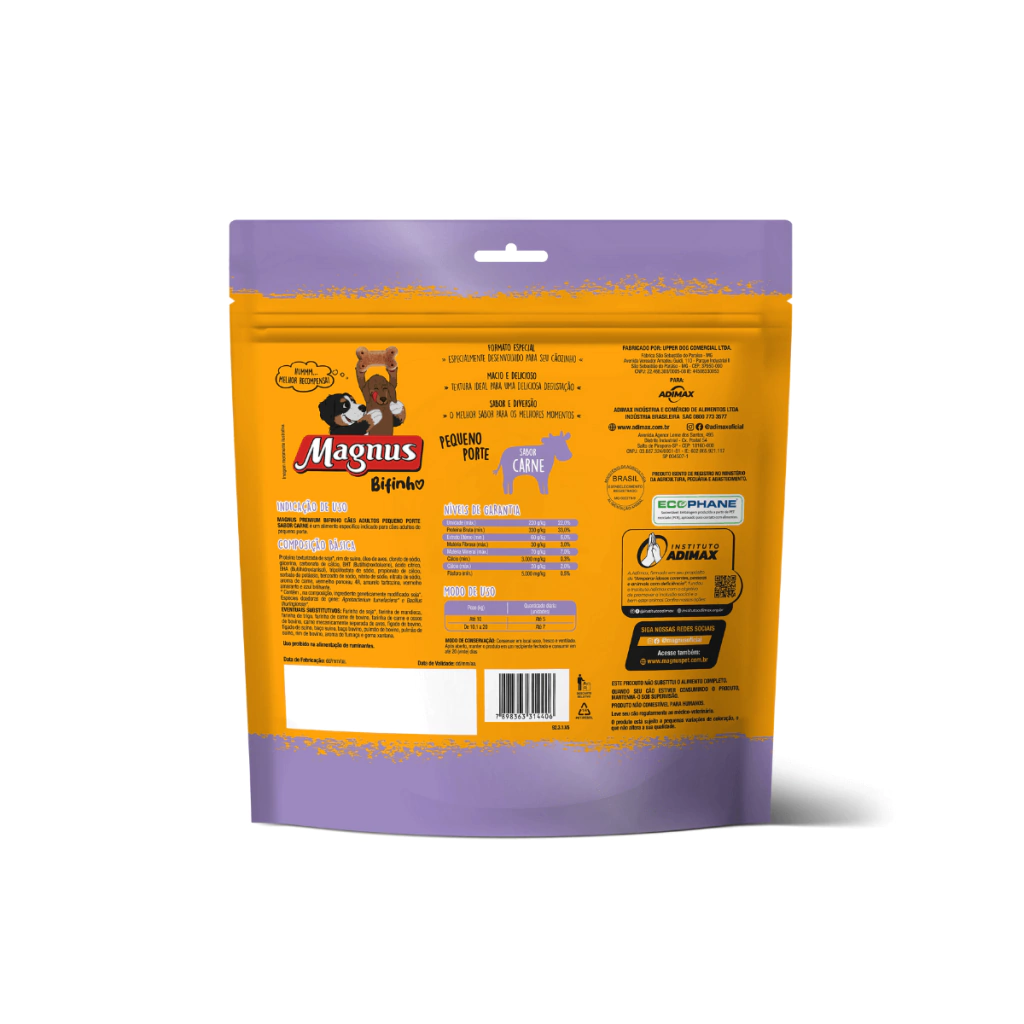 Magnus Bifinho Cães Pequeno Porte Sabor Carne é um petisco especial desenvolvido para cães adultos de portes mini e pequeno. Com textura macia e um delicioso sabor de carne, ele é perfeito para tornar os momentos com seu pet ainda mais divertidos e agradáveis. Além de ser uma ótima opção de agrado, o bifinho contribui para uma alimentação equilibrada, oferecendo nutrientes essenciais. Presenteie seu cão com todo o sabor e carinho que ele merece com Magnus Bifinho.