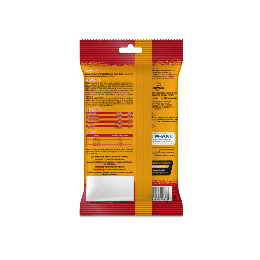 Proteína texturizada de soja*, rim de suíno, óleo de aves, cloreto de sódio, glicerina, carbonato de cálcio, BHT (Butilhidroxitolueno), ácido cítrico, BHA (Butilhidroxianisol), tripolifosfato de sódio, propionato de cálcio, sorbato de potássio, benzoato de sódio, nitrito de sódio, nitrato de sódio, aroma de carne, vermelho ponceau 4R, amarelo tartrazina, vermelho amaranto, azul brilhante. *Contém, na composição, ingrediente geneticamente modificado: soja*. Espécies doadoras de gene: Agrobacterium tumefaciens* e Bacillus thuringiensis*. EVENTUAIS SUBSTITUTIVOS: Farinha de soja*, farinha de mandioca, farinha de trigo, farinha de carne de bovino, farinha de carne e ossos de bovino, carne mecanicamente separada de aves, fígado de bovino, fígado de suíno, baço suíno, baço bovino, pulmão de bovino, pulmão de suíno, rim de bovino, aroma de fumaça, goma xantana.