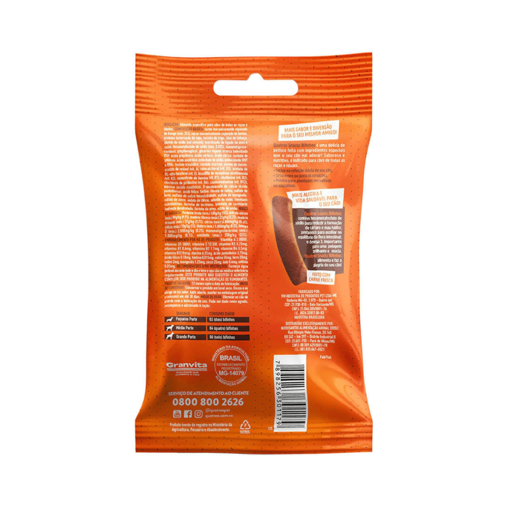 O Petisco Quatree Snacks Bifinhos Carne para Cães é a combinação perfeita de sabor e funcionalidade para o seu pet. Feitos com carne fresca e irresistível, esses bifinhos são enriquecidos com ingredientes que promovem a saúde e bem-estar do seu cachorro. Sua fórmula conta com prebióticos, que auxiliam no equilíbrio da flora intestinal, e com o poder do Ômega 6, garantindo uma pele e pelagem mais bonitas e saudáveis. Além disso, o hexametafosfato de sódio presente no produto ajuda a reduzir a placa bacteriana e o mau hálito, proporcionando uma higiene bucal eficaz.