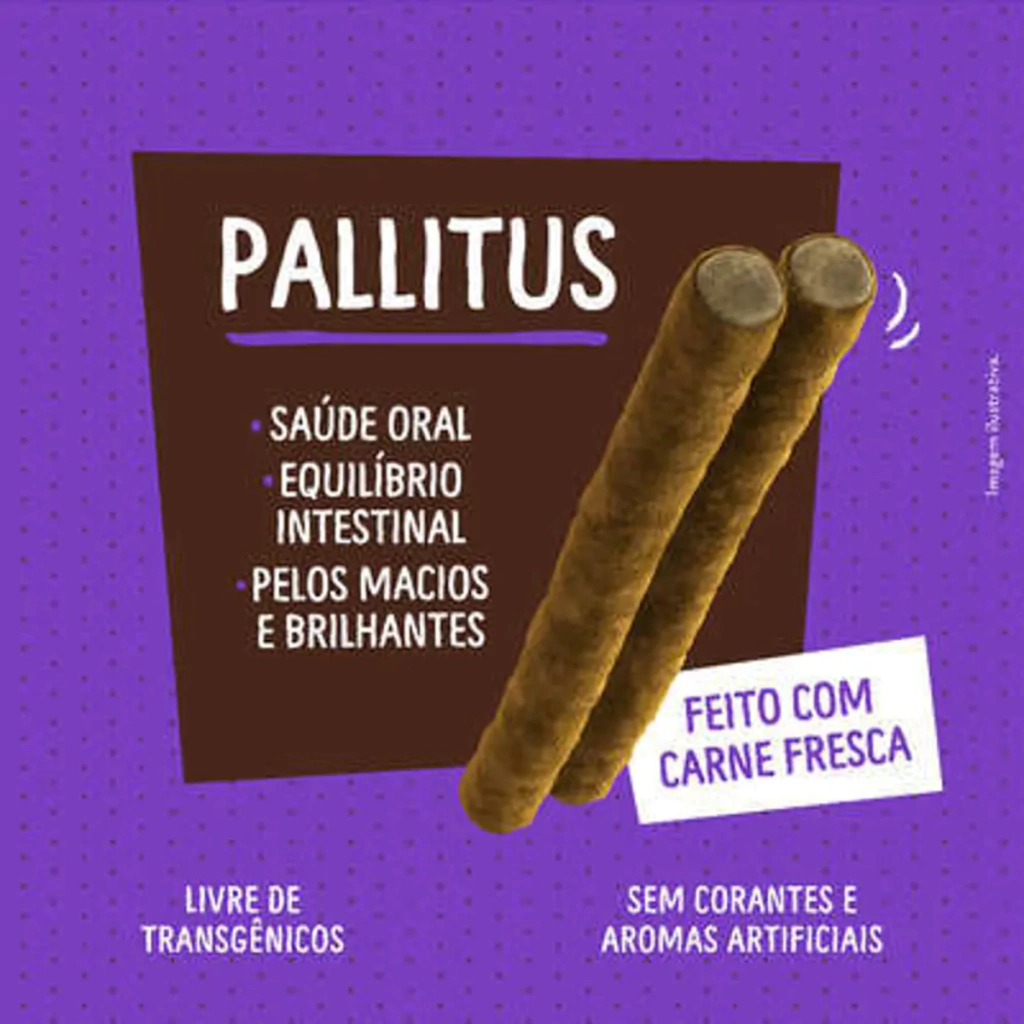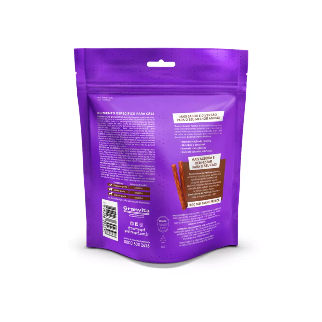 Quatree Snacks Pallitus Sabor Cordeiro e Batata-Doce foi desenvolvido especialmente para promover a saúde oral de cães adultos de porte grande, com benefícios que vão além do sabor irresistível. Esse snack contém hexametafosfato de sódio, que auxilia na redução da formação de tártaro, mantendo a boca do seu cão mais saudável. Rico em colágeno, ele contribui para uma pelagem mais macia e brilhante. Além disso, sua fórmula é livre de transgênicos e corantes artificiais, garantindo uma alimentação mais natural e saudável. Com ingredientes selecionados, como a batata-doce, ele é uma excelente opção para recompensar seu amigão de forma nutritiva e segura.