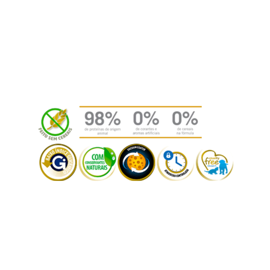 carne de cordeiro, farinha de carne e ossos de ovino (mín. 3%), farinha de vísceras de aves, ovo desidratado, farinha de peixe, farinha de torresmo (proteína isolada de suíno), amido de batata, amido de mandioca, óleo de peixe, óleo de frango, polpa de beterraba, casca de ervilha, alfafa desidratada, lignocelulose, semente de psyllium, levedura seca de cervejaria, cenoura desidratada, espinafre desidratado, laranja desidratada, maçã desidratada, blueberry desidratado (mín. 0,075%), extrato de romã, extrato de chá verde, extrato de aloe vera, cúrcuma em pó, beta caroteno, aditivos prebióticos (FOS e MOS), DL-metionina, taurina, L-carnitina, sulfato de condroitina, sulfato de glicosamina, aditivos adsorventes (extrato de yucca e zeolita), hidrolisado de fígado de frango e suíno, vitaminas (A, D3, E, B1, B2, B6, B12, C, biotina, niacina, ácido pantotênico, ácido fólico, cloreto de colina), cloreto de potássio, ferro aminoácido quelato, cobre aminoácido quelato, zinco aminoácido quelato, manganês aminoácido quelato, proteinato de selênio, iodato de cálcio, propionato de cálcio, concentrado de tocoferóis.Eventual substitutivo: proteína hidrolisada de peixe.