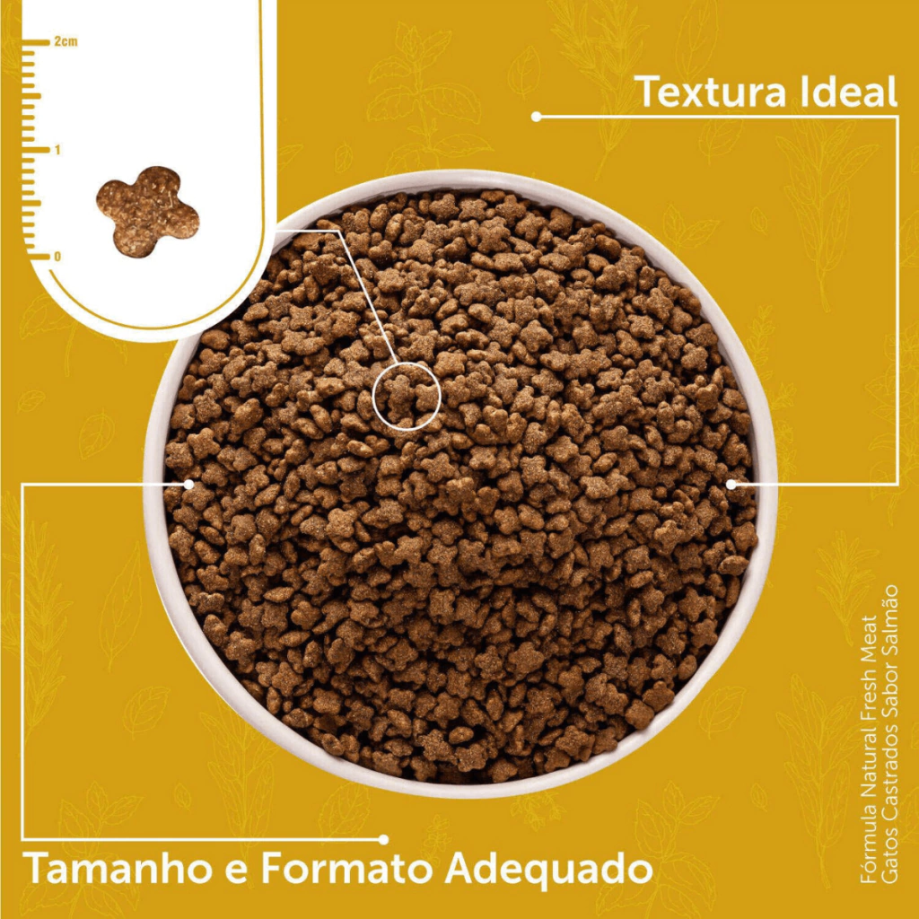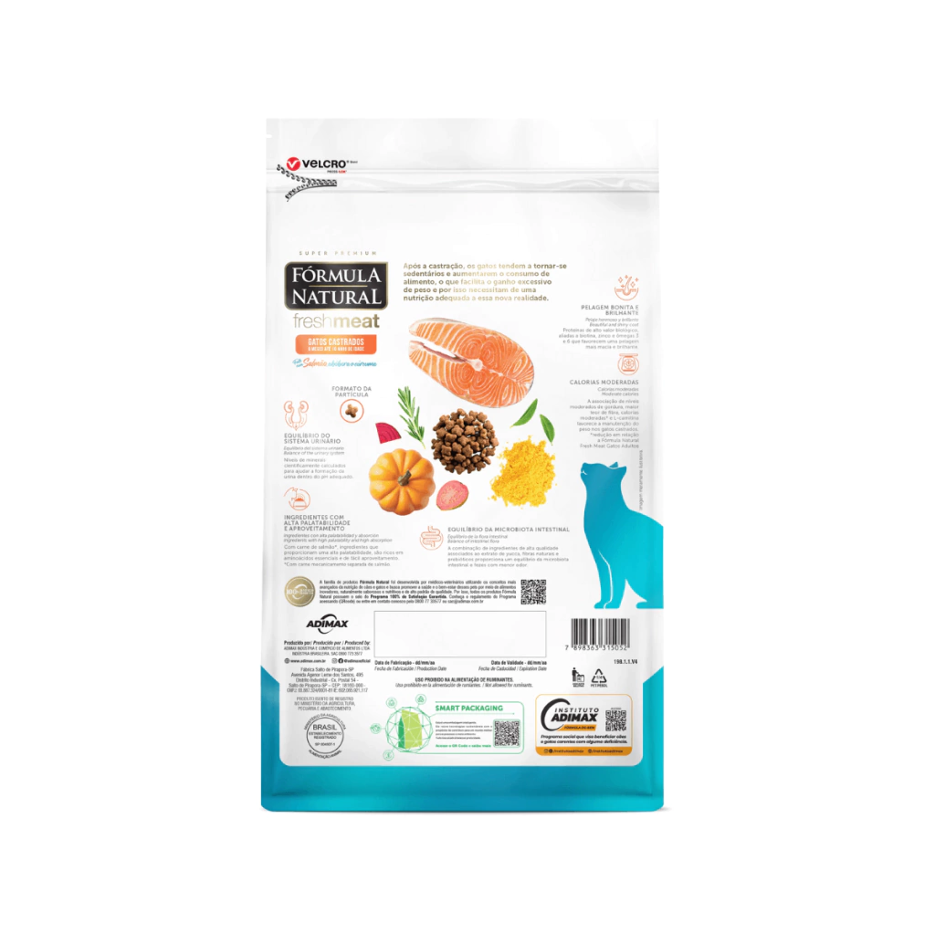 Desenvolvida por médicos veterinários, a linha Fórmula Natural Fresh Meat utiliza os conceitos mais avançados da nutrição de cães e gatos. Naturalmente saborosa e nutritiva, possui como grande diferencial a utilização de carne fresca e fontes especiais de carboidratos, fibras, vitaminas e minerais, como as frutas e vegetais. É uma linha completa que oferece versões com cuidados específicos para diferentes necessidades e estágios de vida. Fórmula Natural Fresh Meat Gatos Castrados Sabor Salmão oferece um teor menor de calorias e mais fibras para gatos adultos castrados.