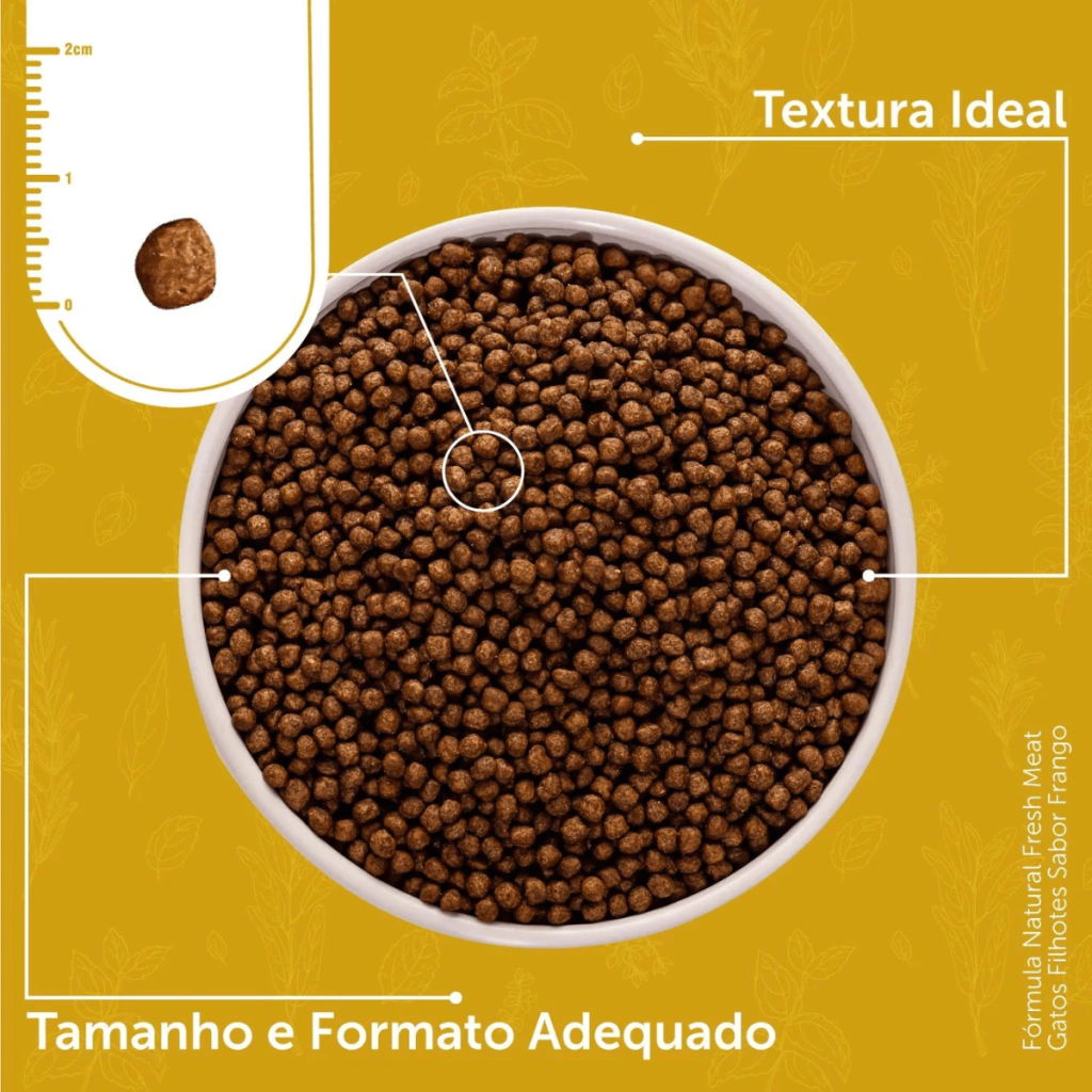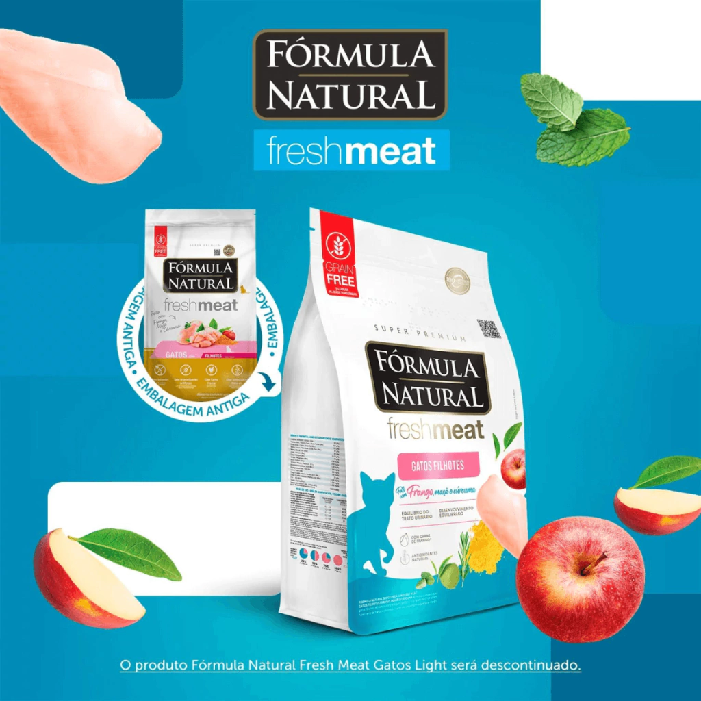 Desenvolvida por médicos veterinários, a linha Fórmula Natural Fresh Meat utiliza os conceitos mais avançados da nutrição de cães e gatos. Naturalmente saborosa e nutritiva, possui como grande diferencial a utilização de carne fresca e fontes especiais de carboidratos, fibras, vitaminas e minerais, como as frutas e vegetais. É uma linha completa que oferece versões com cuidados específicos para diferentes necessidades e estágios de vida. Fórmula Natural Fresh Meat Gatos Filhotes oferece todos os cuidados para um ótimo desenvolvimento de gatos filhotes, do desmame até 12 meses de idade.