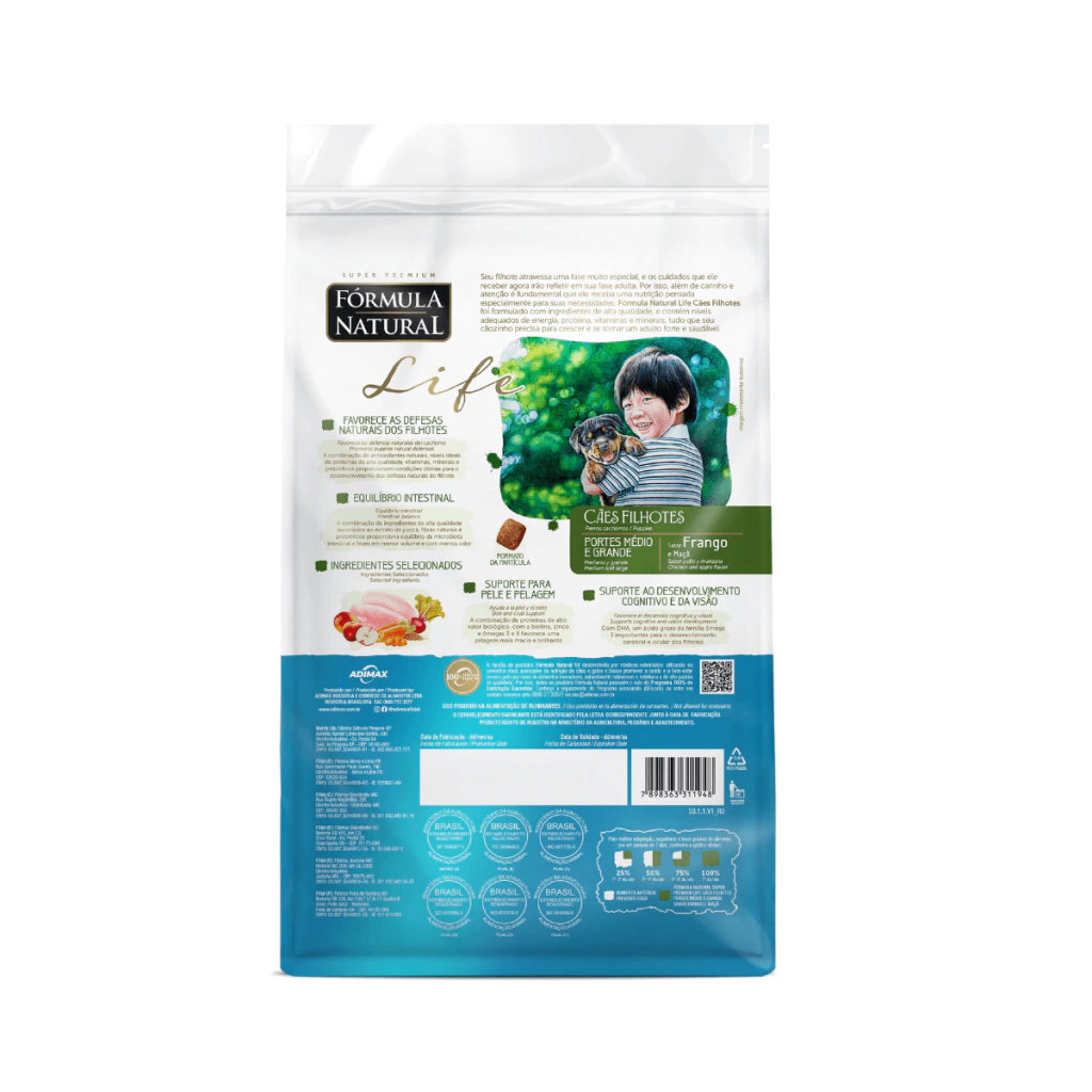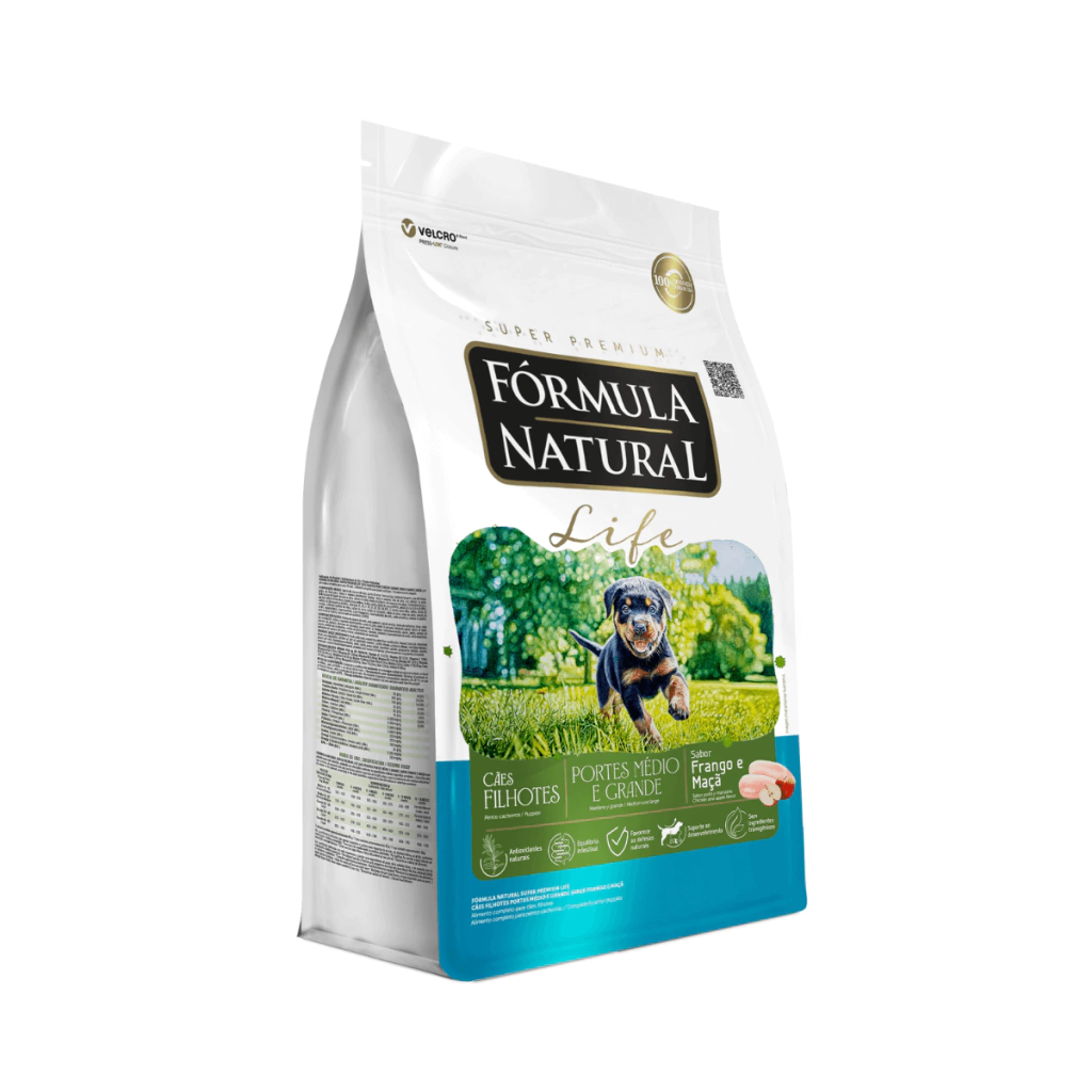 Com um conceito natural do produto às embalagens, a Fórmula Natural foi formulada para promover uma vida mais saudável, longeva e de bem-estar para cães e gatos. A linha oferece versões para diferentes portes e idades e proporciona entre outros benefícios, cuidados com a pele e pelagem, equilíbrio da flora intestinal e antioxidantes naturais. Fórmula Natural Super Premium Cães Filhotes Portes Médio e Grande oferece todos os cuidados para um ótimo desenvolvimento dos cães filhotes de porte médio e grande, do desmame até 18 meses de idade.