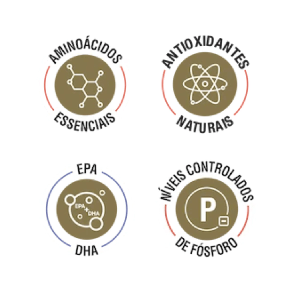 Carne de frango com ossos, fígado de frango, proteína hidrolisada de aves, arroz quirera, farinha de torresmo, levedura de cervejaria intivada desidratada, fibra de cana-de-açúcar, polpa de beterraba, óleo de aves, óleo de salmão, óleo de linhaça, hidrolisado de fígado de aves e miúdos suínos, farinha de linhaça, cloreto de sódio, ovo em pó, biomassa de microalgas (Schizochytrium sp.), parede celular de levedura, frutooligossacarídeos, inulina, probiótico, extrato de yucca, vitaminas (retinol, colecalciferol, acetato de DL-alfa-tocoferol, menadiona bissulfito de sódio, ácido ascórbico, cloridrato de tiamina, riboflavina, piridoxina, cianocobalamina, biotina, pantotenato de cálcio, ácido fólico, niacina, cloreto de colina), minerais (sulfato de ferro, sulfato de cobre, iodato de cálcio, cloreto de potássio, proteinato de zinco, sulfato de zinco, sulfato de manganês, levedura enriquecida com selênio, selenito de sódio, proteinado de manganês), carbonato de cálcio, taurina, leucina, valina, isoleucina, treonina, triptofano, extrato de chá verde, extrato de alecrim, cúrcuma, concentrado de tocoferóis (antioxidante natural) (0,01%).