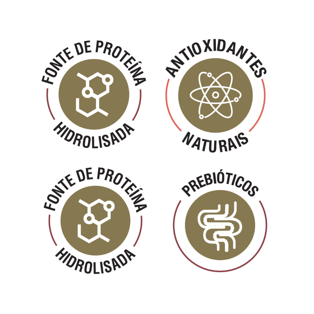 Proteína hidrolisada de frango (mín. 20%), fécula de mandioca, farinha de mandioca, levedura de cana-de-açúcar inativada e desidratada, polpa de beterraba, fibra de cana-de-açúcar, óleo de aves, óleo de salmão, óleo de girassol, óleo de linhaça, cloreto de sódio, biomassa de microalgas (Schizochytrium sp.), zeolita, parede celular de levedura, frutooligossacarídeos, inulina, vitaminas (retinol, colecalciferol, acetato de DL-alfa-tocoferol, menadiona bissulfito de sódio, ácido ascórbico, cloridrato de tiamina, riboflavina, piridoxina, cianocobalamina, biotina, pantotenato de cálcio, ácido fólico, niacina, cloreto de colina), minerais (sulfato de ferro, sulfato de manganês, sulfato de zinco, iodato de cálcio, selenito de sódio, sulfato de cobre, proteinato de zinco, levedura enriquecida com selênio, cloreto de potássio, proteinato de manganês), fosfato bicálcico, carbonato de cálcio, lisina, metionina, extrato de chá verde, extrato de alecrim, concentrado de tocoferóis (antioxidante natural) (0,01%).