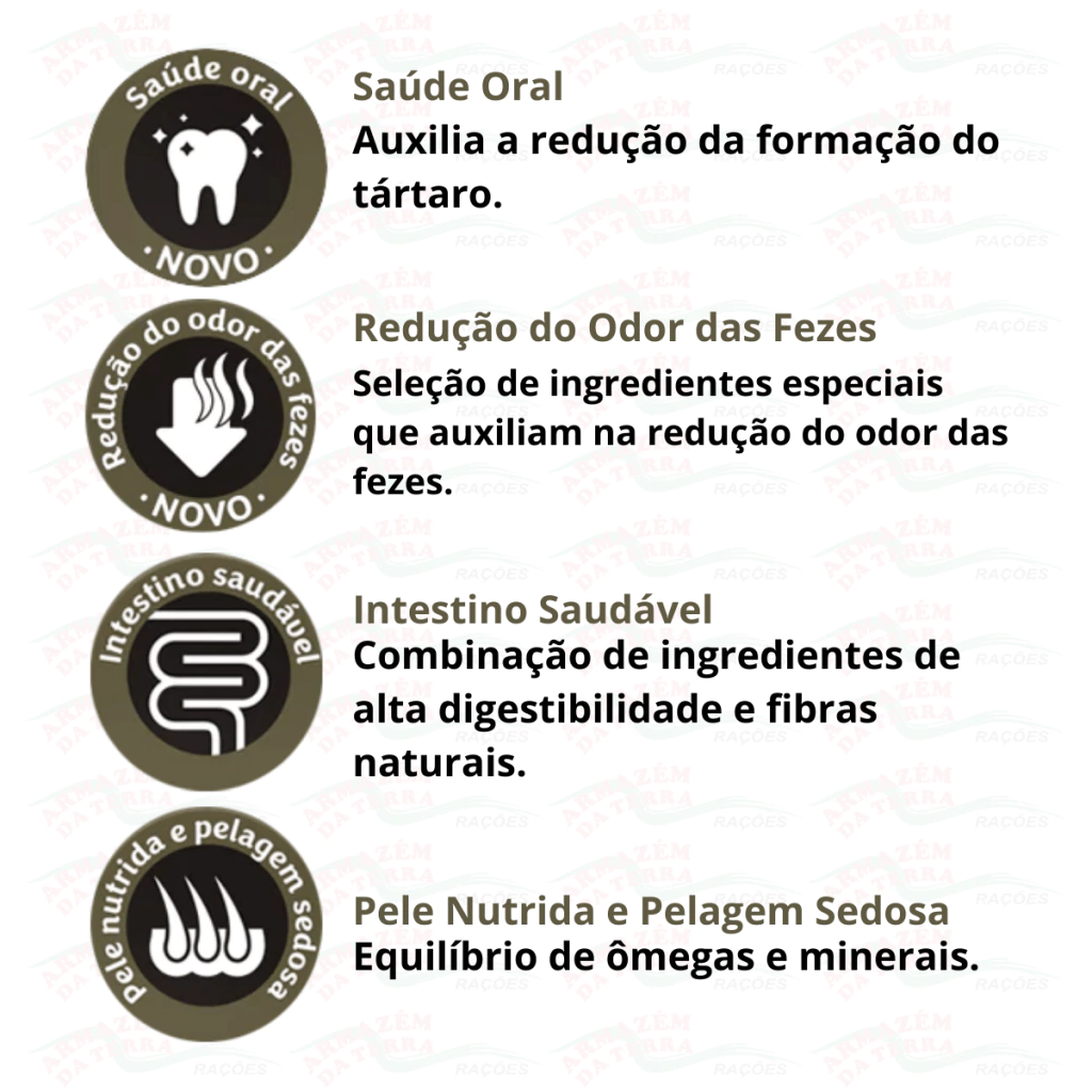 Com uma seleção e ingredientes especiais auxilia na redução do odor das fezes e favorece a saúde intestinal por conter fibras naturais. Contribui ainda para uma pele nutrida e pelagem sedosa além de auxiliar na redução da formação do tártaro.