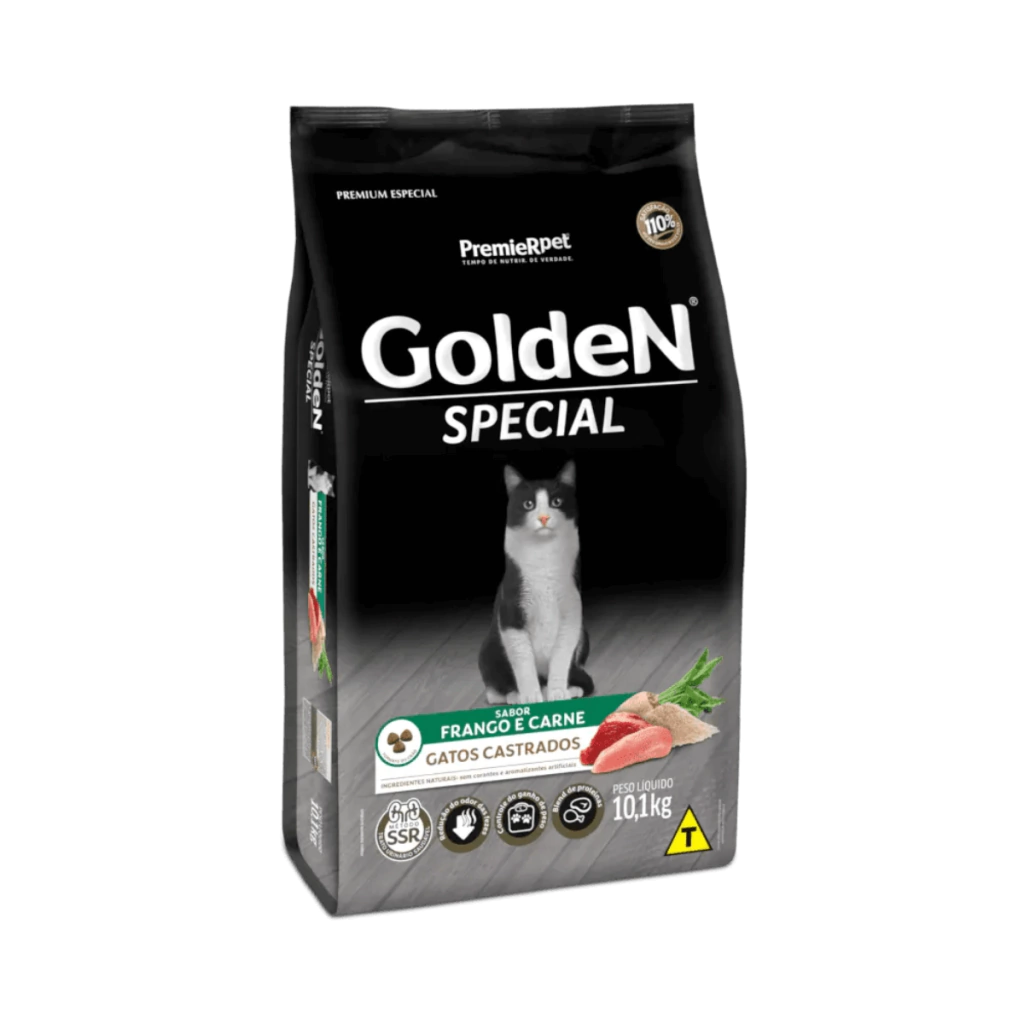 GoldeN Special Gatos Castrados Sabor Frango e Carne é um alimento completo, balanceado e rico em nutrientes, indicado para gatos castrados a partir dos 6 meses de idade e contraindicado para filhotes de idade inferior a 6 meses, fêmeas gestantes e lactantes, devido ao seu reduzido teor calórico.