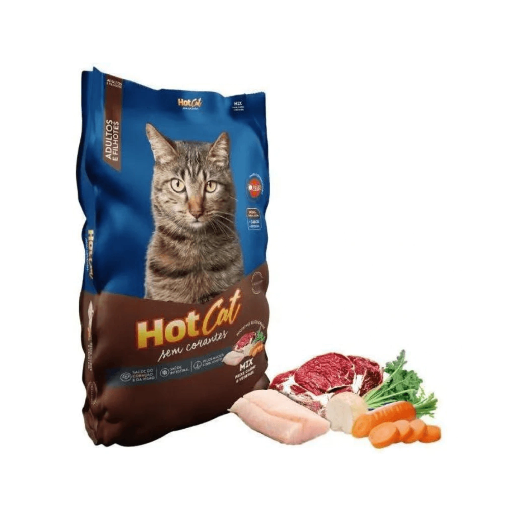 A Ração Seca Hot Cat Mix Sem Corantes para Gatos Filhotes e Adultos é um alimento completo indicado para gatos de todos os portes. Possui fontes de ômegas 3 e 6, balanceamento de vitaminas, minerais, além dos aminoácidos: taurina, lisina e metionina. Não contém corantes em sua composição, formulada com matérias-primas previamente certificadas em laboratório. Uma ração ideal para proporcionar saúde e bem-estar para seu amiguinho.