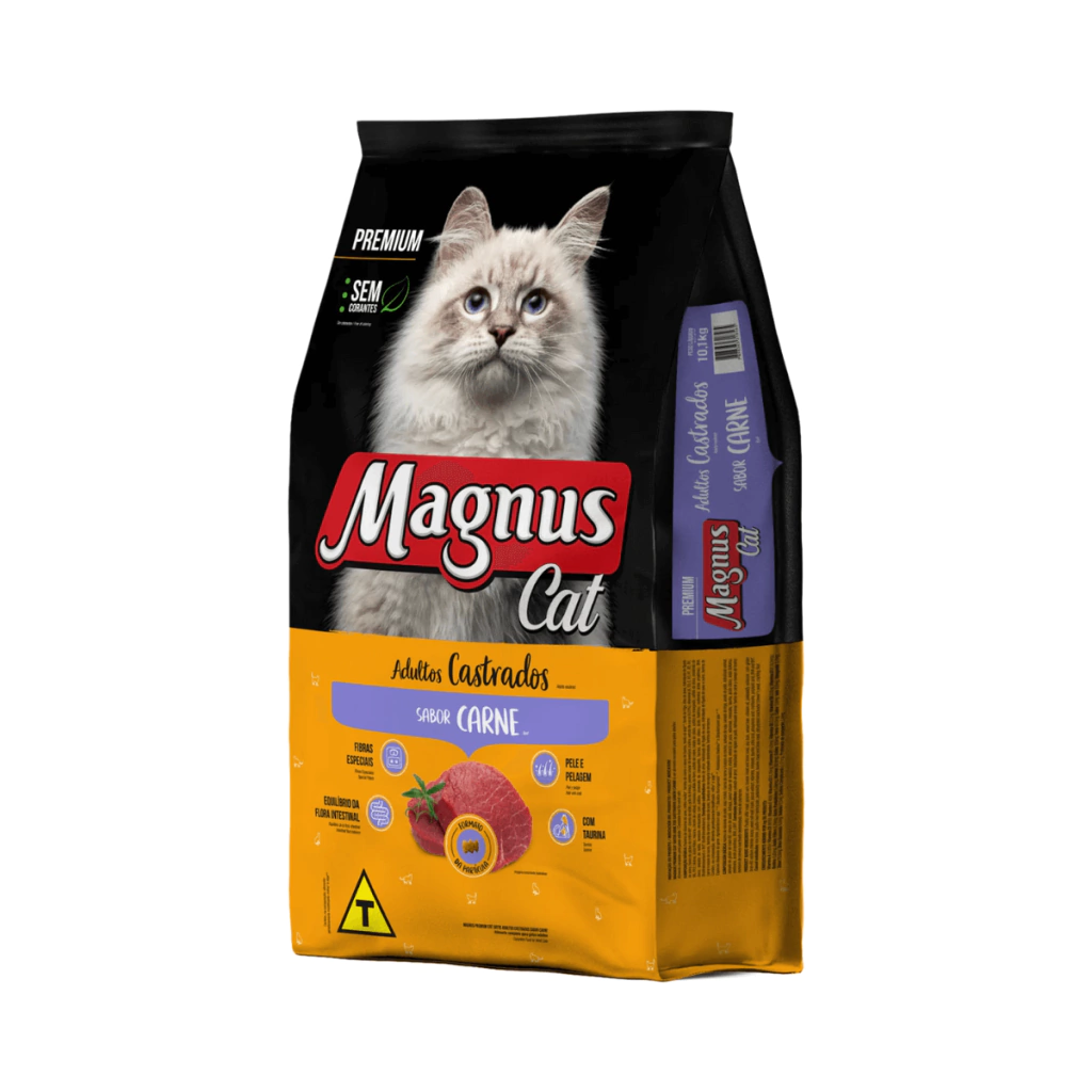 Magnus Cat Premium Gatos Adultos Castrados Sabor Carne é um alimento seco completo, formulado com precisão para atender as exigências do gato adulto castrado, de qualquer raça. Nutritivo e saboroso, agrada ao paladar diferenciado do gato, provendo benefícios a sua vida. BIO COMPLEX é um exclusivo complexo de ingredientes que promovem benefícios para o seu gato. Sabor irresistível: feito com ingredientes de alta qualidade. Equilíbrio da flora intestinal: Prebióticos, Fibras e Extrato de Yucca, a combinação destes ingredientes auxilia na formação das fezes mais. Pele e Pelagem: Ômegas 3 e 6, Biotina, Zinco Quelato, importantes para a manutenção da pele e pelagem sedosa e brilhante. Taurina: aminoácido essencial para o coração e visão.