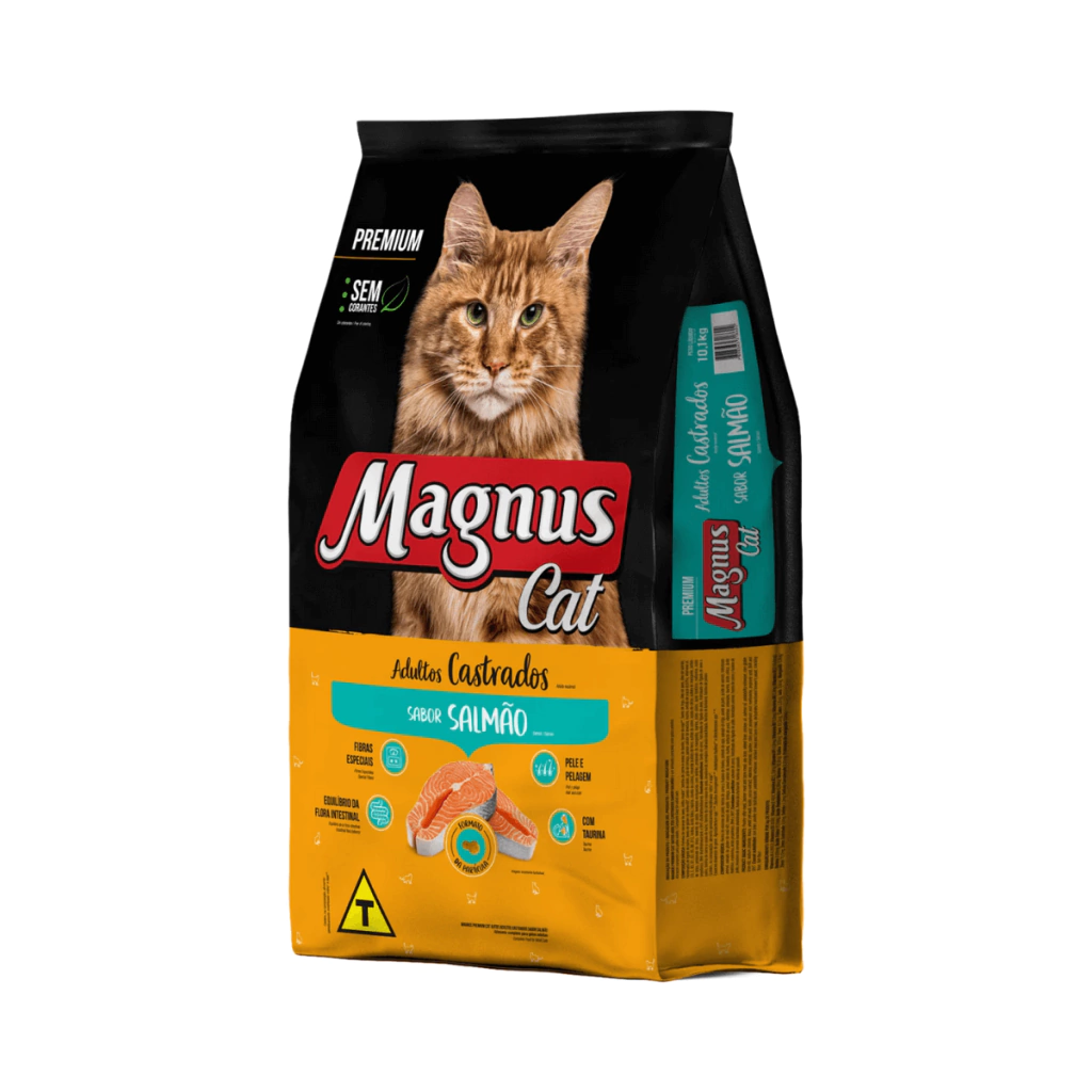 Magnus Cat Premium Gatos Adultos Castrados Sabor Salmão é um alimento seco completo, formulado com precisão para atender as exigências do gato adulto castrado, de qualquer raça. Nutritivo e saboroso, agrada ao paladar diferenciado do gato, provendo benefícios a sua vida. BIO COMPLEX é um exclusivo complexo de ingredientes que promovem benefícios para o seu gato. Sabor irresistível: feito com ingredientes de alta qualidade. Equilíbrio da flora intestinal: Prebióticos, Fibras e Extrato de Yucca, a combinação destes ingredientes auxilia na formação das fezes mais. Pele e Pelagem: Ômegas 3 e 6, Biotina, Zinco Quelato, importantes para a manutenção da pele e pelagem sedosa e brilhante. Taurina: aminoácido essencial para o coração e visão.