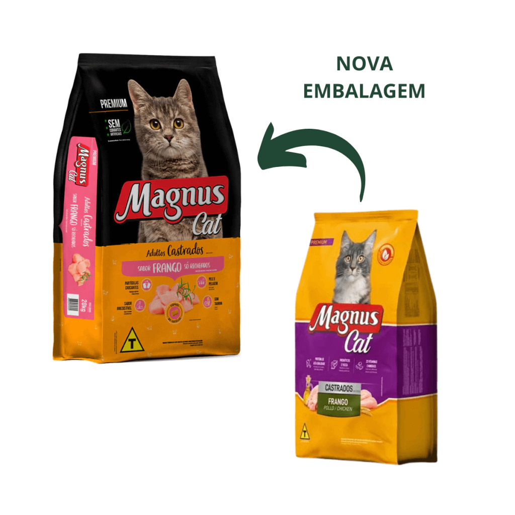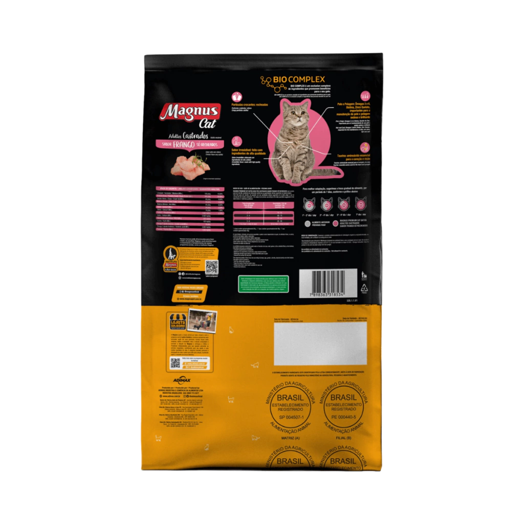 A Ração Magnus Cat Frango Gatos Adultos Castrados é nutritiva e saborosa, agradando o paladar dos gatos e trazendo benefícios para a saúde deles. O BIO COMPLEX é um exclusivo conjunto de ingredientes que ajuda na saúde geral do gato. Além disso, essa ração é composta de ingredientes de alta qualidade e auxilia na formação de fezes saudáveis com a combinação de prebióticos, fibras e extrato de yucca. A fórmula também inclui ômegas 3 e 6, biotina e zinco quelato, ajudando a manter a pele e pelagem do gato saudáveis e brilhantes. Além disso, a taurina presente na ração é um aminoácido essencial para a saúde do coração e da visão do seu melhor amigo .