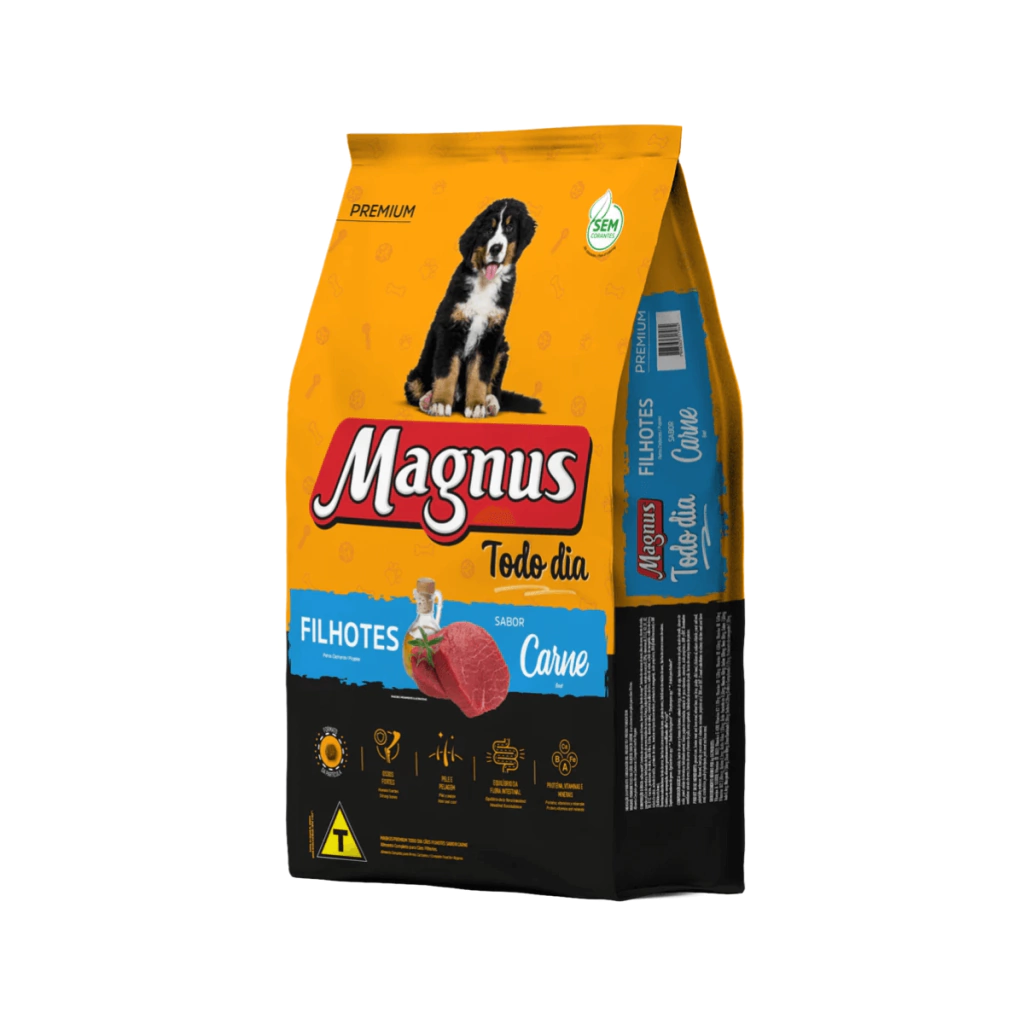 A Magnus é uma consagrada família de produtos para cães e gatos que inclui uma grande variedade de alimentos, tanto completos (secos e úmidos) quanto petiscos, como os biscoitos e bifinhos. Saborosos e nutritivos, os alimentos das linhas Magnus atendem diferentes necessidades e agradam até os paladares mais exigentes. Assim como todos os alimentos Adimax, as linhas Magnus passam, do começo ao fim, por um rigoroso controle de qualidade: da seleção dos fornecedores e ingredientes até a entrega dos produtos e suporte pós-venda. Tudo é pensado para atender com excelência nossos clientes e parceiros. Magnus Premium Cães Filhotes Sabor Carne é um alimento completo, elaborado especialmente para cães em crescimento. Sua formulação balanceada proporciona nutrição necessária durante essa importante fase de desenvolvimento do seu filhote. Proteína de Alta qualidade Prebióticos e Yucca 23 Vitaminas e Minerais