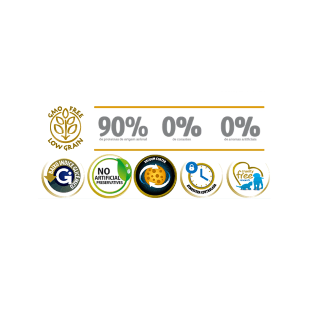 Umidade (máx.) 90g/kg(9%); Proteína Bruta (mín.) 280g/kg(28%); Extrato Etéreo (mín.) 180g/kg(18%); Matéria Fibrosa (máx.) 29g/kg(2,9%); Matéria Mineral (máx.) 82g/kg(8,2%); Cálcio (mín.) 8.000mg/kg(0,8%); Cálcio (máx.) 16g/kg(1,6%); Fósforo (mín.) 7.000mg/kg(0,7%); Sódio (mín.) 2.000mg/kg; Potássio (mín.) 5.000mg/kg; Magnésio (mín.) 900mg/kg; Ômega 6 (mín.) 25g/kg; Ômega 3 (mín.) 2.500mg/kg; DHA (mín.) 500mg/kg; EPA (mín.) 400mg/kg; Fruto-Oligossacarídeos (mín.) 400mg/kg; Mannan-Oligossacarídeos (mín.) 240mg/kg; Metionina (mín.) 5.000mg/kg; Taurina (mín.) 1.000mg/kg; L-Carnitina (mín.) 100mg/kg; Lisina (mín.) 11g/kg; Sulfato de Condroitina (mín.) 200mg/kg; Sulfato de Glicosamina (mín.) 300mg/kg.