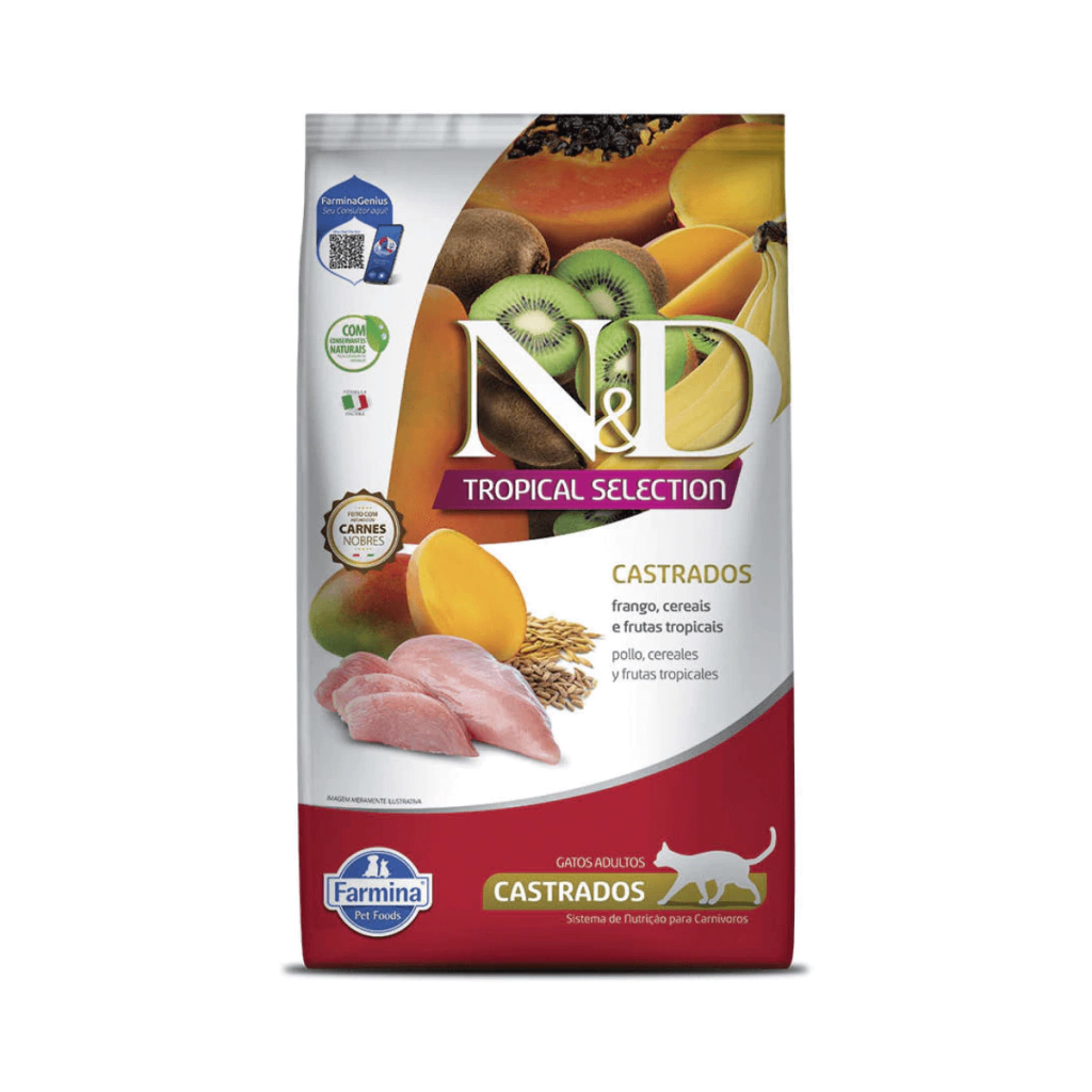 A Ração Seca N&D Tropical Selection Frango, Cereais e Frutas Tropicais para Gatos Adultos Castrados é uma escolha excepcional para o bem-estar do seu amigo felino, uma vez que combina grãos ancestrais e uma variedade de frutas tropicais, proporcionando uma nutrição completa e deliciosa. As frutas tropicais, conhecidas por suas propriedades nutricionais e riqueza em antioxidantes naturais, são harmoniosamente misturadas com grãos ancestrais de baixo índice glicêmico, como espelta e aveia, que promovem a sensação de saciedade, tornando esta ração irresistível para seu pet.