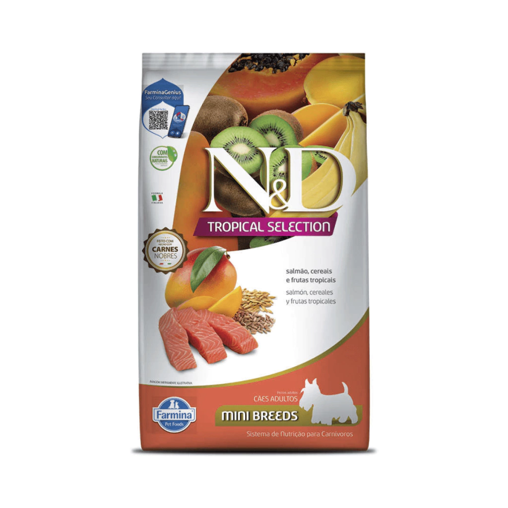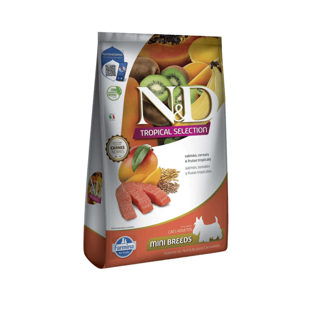A Ração Seca N&D Tropical Selection Salmão, Cereais e Frutas Tropicais para Cães Adultos de Raças Minis é uma escolha excepcional para o bem-estar do seu amigo canino, uma vez que combina grãos ancestrais e uma variedade de frutas tropicais, proporcionando uma nutrição completa e deliciosa. As frutas tropicais, conhecidas por suas propriedades nutricionais e riqueza em antioxidantes naturais, são harmoniosamente misturadas com grãos ancestrais de baixo índice glicêmico, como espelta e aveia, que promovem a sensação de saciedade, tornando esta ração irresistível para seu pet.
