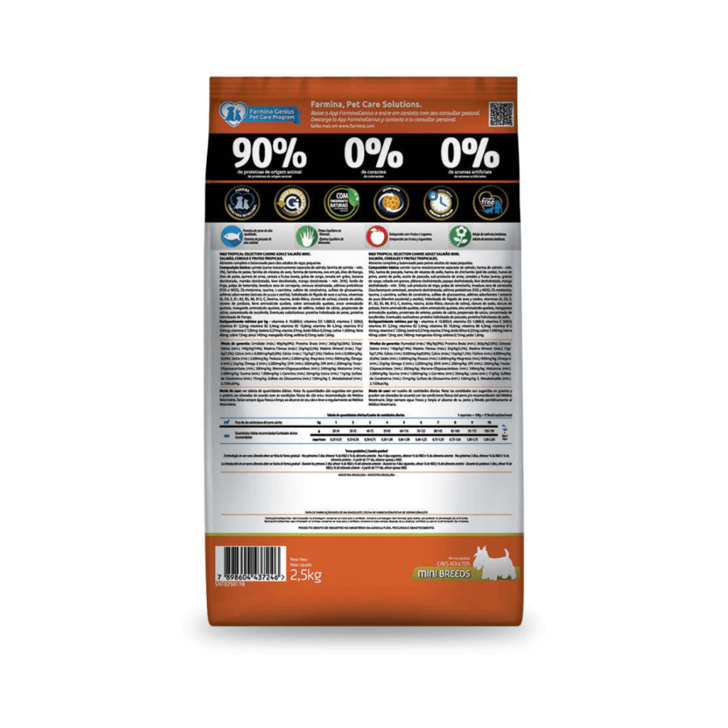 Salmão (carne mecanicamente separada de salmão, farinha de salmão – mín. 5%), farinha de peixe, farinha de vísceras de aves, farinha de torresmo, ovo em pó, óleo de frango, óleo de peixe, quirera de arroz, cereais e frutas (aveia, grãos de sorgo, cevada em grãos, banana desidratada, mamão desidratado, kiwi desidratado, manga desidratada – mín. 35%), farelo de trigo, polpa de beterraba, levedura seca de cervejaria, cenoura desidratada, aditivos prebióticos (FOS e MOS), DL-metionina, taurina, L-carnitina, sulfato de condroitina, sulfato de glicosamina, aditivos adsorventes (extrato de yucca e zeolita), hidrolisado de fígado de aves e suínos, vitaminas (A, D3, E, B1, B2, B5, B6, B12, C, biotina, niacina, ácido fólico, cloreto de colina), cloreto de sódio, cloreto de potássio, ferro aminoácido quelato, cobre aminoácido quelato, zinco aminoácido quelato, manganês aminoácido quelato, proteinato de selênio, iodato de cálcio, propionato de cálcio, concentrado de tocoferóis.