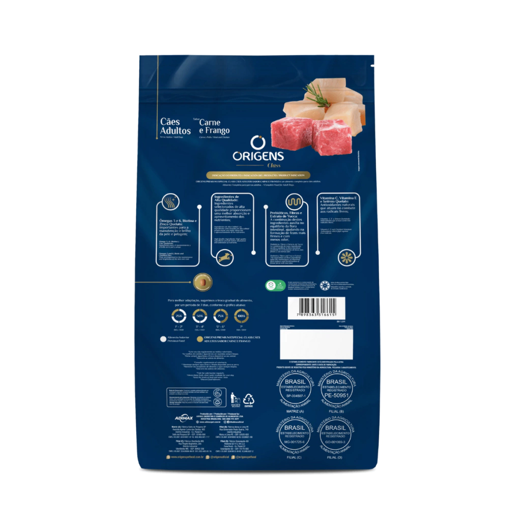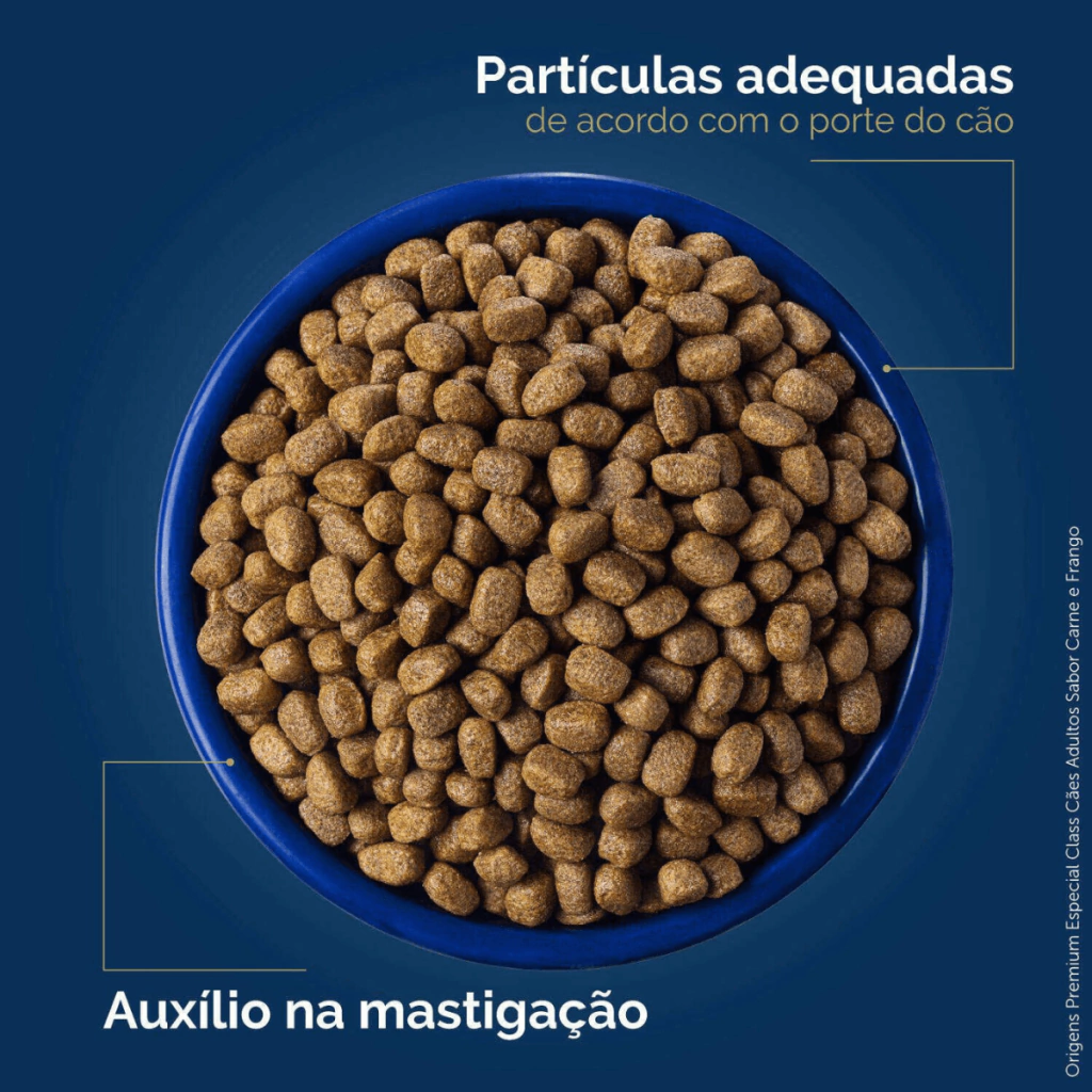 Origens Class Carne e Frango Cães Adultos é uma linha de alimentos Premium Especial formulada por especialistas e sob os conceitos mais atuais da nutrição de cães, consistindo em um alimento de alta qualidade. Com ingredientes selecionados e balanceados, Origens Class oferece níveis nutricionais adequados para cães adultos, além de permitir uma alta absorção e aproveitamento dos nutrientes pelo organismo do pet.