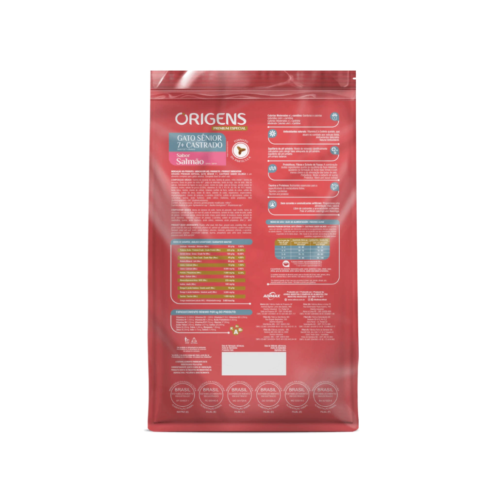 Origens é uma linha de alimentos Premium Especial que nutre o que há de melhor: o amor. Promover saúde e prazer a cada refeição é antes de tudo um ato de carinho, que estreita laços e prolonga os dias de alegria, amizade e amor incondicional entre tutores e seus cães e gatos. Origens Premium Especial Gato Sênior 7+ Castrado Sabor Salmão possui ingredientes de alta qualidade e não contém corantes e aromatizantes artificiais.