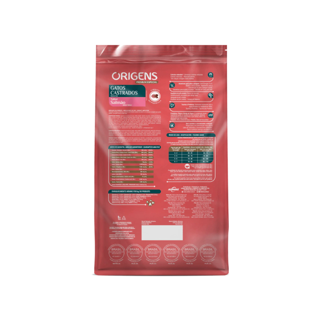 Origens é uma linha de alimentos Premium Especial que nutre o que há de melhor: o amor. Promover saúde e prazer a cada refeição é antes de tudo um ato de carinho, que estreita laços e prolonga os dias de alegria, amizade e amor incondicional entre tutores e seus cães e gatos. Origens Gatos Castrados Sabor Salmão possui ingredientes de alta qualidade e não contém corantes e aromatizantes artificiais. Indicado para gatos castrados, sedentários, com tendência a engordar e para quem tem mais de um gato em casa.