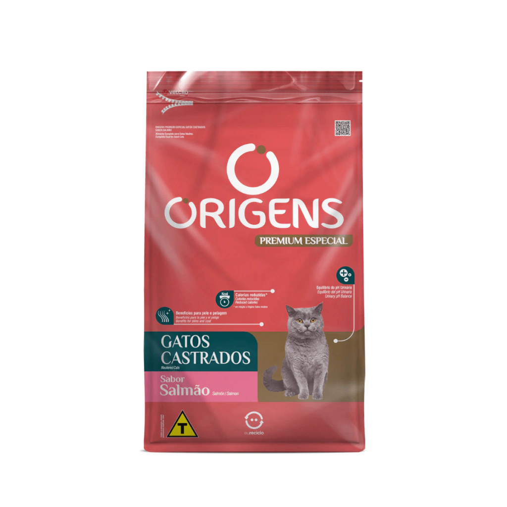 Origens é uma linha de alimentos Premium Especial que nutre o que há de melhor: o amor. Promover saúde e prazer a cada refeição é antes de tudo um ato de carinho, que estreita laços e prolonga os dias de alegria, amizade e amor incondicional entre tutores e seus cães e gatos. Origens Gatos Castrados Sabor Salmão possui ingredientes de alta qualidade e não contém corantes e aromatizantes artificiais. Indicado para gatos castrados, sedentários, com tendência a engordar e para quem tem mais de um gato em casa.
