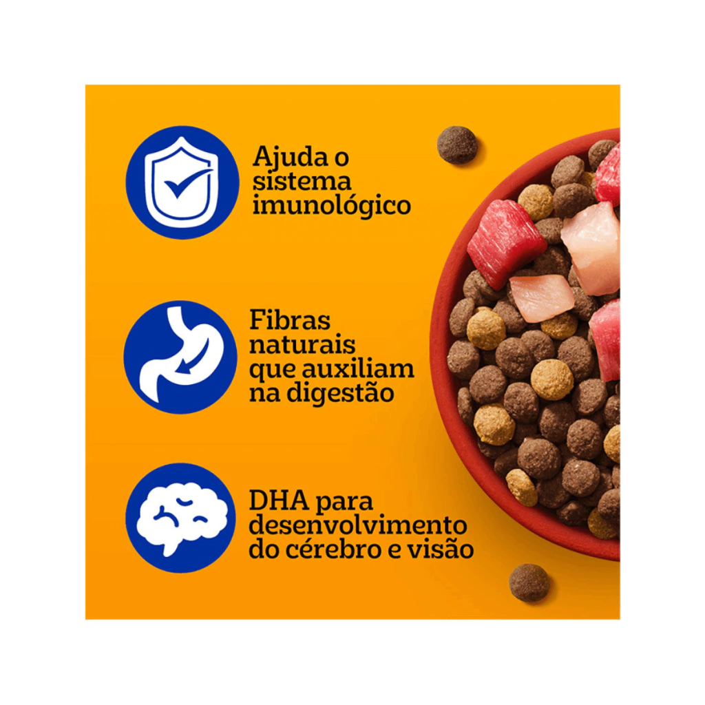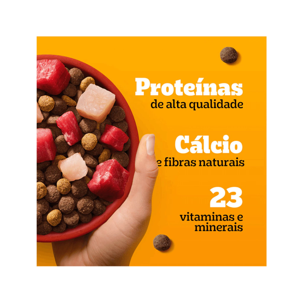 Farinha de Subprodutos de Frango, Farinha de Carne e Ossos de Bovinos, Glúten de Milho*, Milho Integral Moído*, Gordura de Aves, Óleo de Peixe Refinado, Parede celular de levedura (prebiótico MOS) (mín. 0,05%), Leite em pó integral , Farelo de Soja**, Vitaminas (Vitamina A (Retinol), D3 (Colecalciferol), E (Acetato DL Alfa-Tocoferol), B1 (Tiamina), B2 (Riboflavina), B6 (Piridoxina), B12 (Cianocobalamina), Niacina, Ácido Pantotênico, Ácido Fólico e Cloreto de Colina), Minerais (Cloreto de Sódio - sal comum -, Óxido de Zinco, Cloreto de Potássio, Sulfato de Cobre, Iodato de Cálcio e Selenito de Sódio), Hidrolisado de Fígado de Ave e Suíno, Aluminosilicato, BHT e Caramelo IV. Eventuais substitutivos: Farinha de Carne e Ossos de Suíno, Sorgo Integral Moído, Quirera de Arroz, Cevada em Grão, Trigo Integral, Farelo de Milho*. *Espécies doadoras do gene: Agrobacterium tumefaciens, Bacillus thuringiensis, Streptomyces viridochromogenes, Zea mays, Sphingobium herbicidorovans, Dicossoma sp., Diabrotica firgifera, Thermoccocales spp, Bacillus substilis. **Espécies doadoras do gene: Agrobacterium tumefaciens, Bacillus thuringiensis, Streptomyces viridochromogenes, Arabidopsis thaliana, Delftia acidovorans, Pseudomonas fluorescens, Zea mays, Stenotrophomonas maltophilia, B.T. var Azawai e Kurstaqui, Agrobacterium sp.