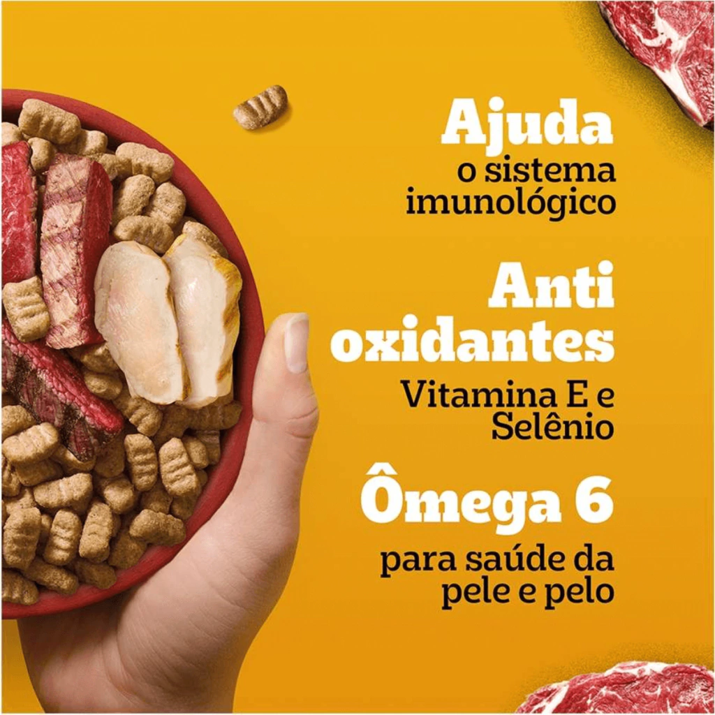 A Ração Seca Pedigree High Protein Carne e Frango para Cães Adultos é um alimento completo com fórmula cuidadosamente equilibrada e ingredientes de alta qualidade, proporcionando uma alimentação que respeita o instinto ancestral do seu cão, enquanto oferece benefícios notáveis para sua saúde e vitalidade. A linha High Protein apresenta um teor elevado de proteínas de alta qualidade (+28%) e é livre de corantes e aromatizantes artificiais, garantindo uma alimentação mais natural e saudável para o seu fiel companheiro.