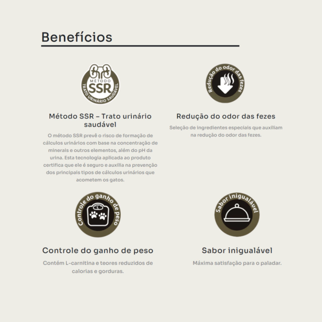 - Redução do odor das fezes: seleção de ingredientes especiais que auxiliam na redução do odor das fezes.