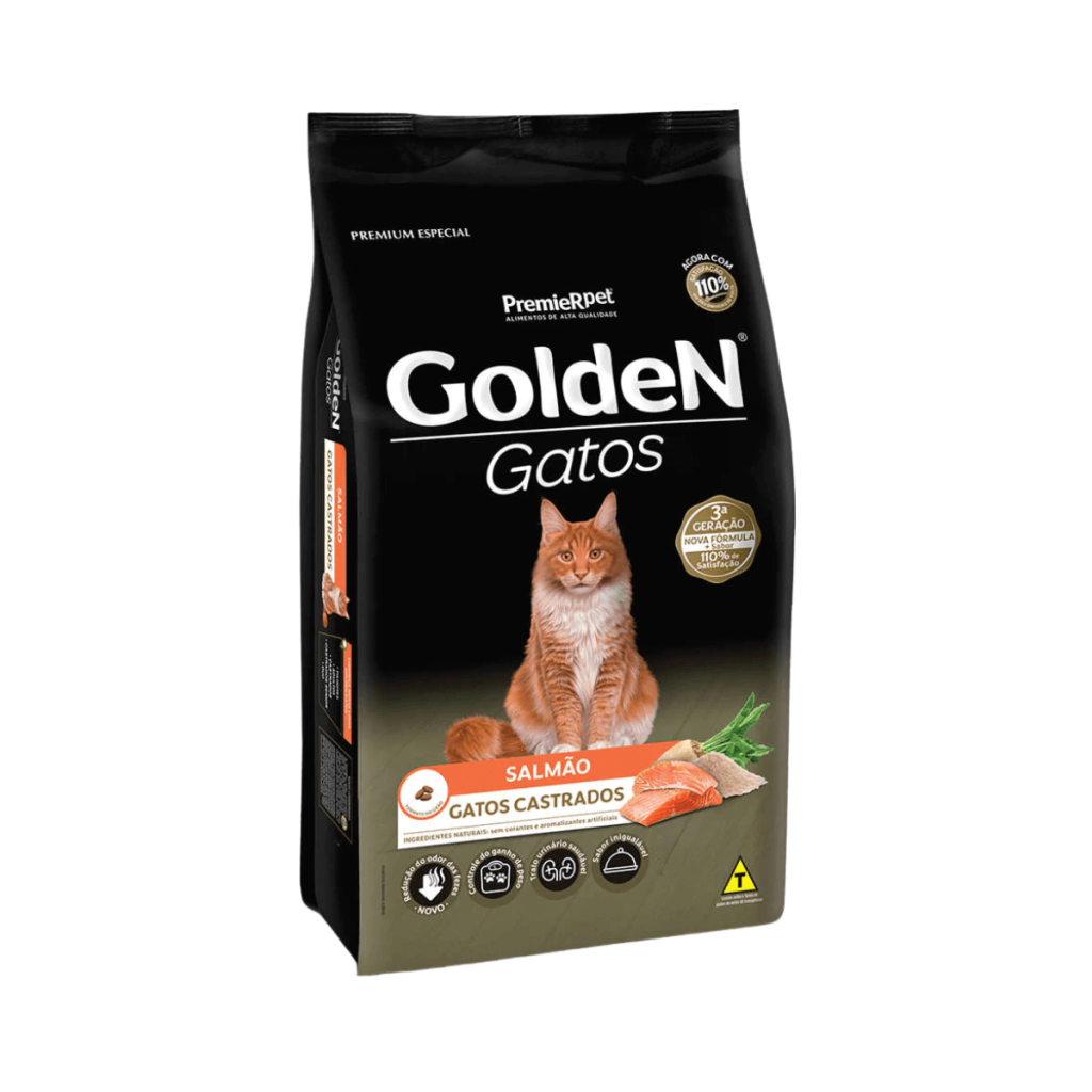 GoldeN Gatos Castrados Salmão auxilia na prevenção da obesidade e no cuidado com o trato urinário, garantindo uma nutrição ótima e saudável.