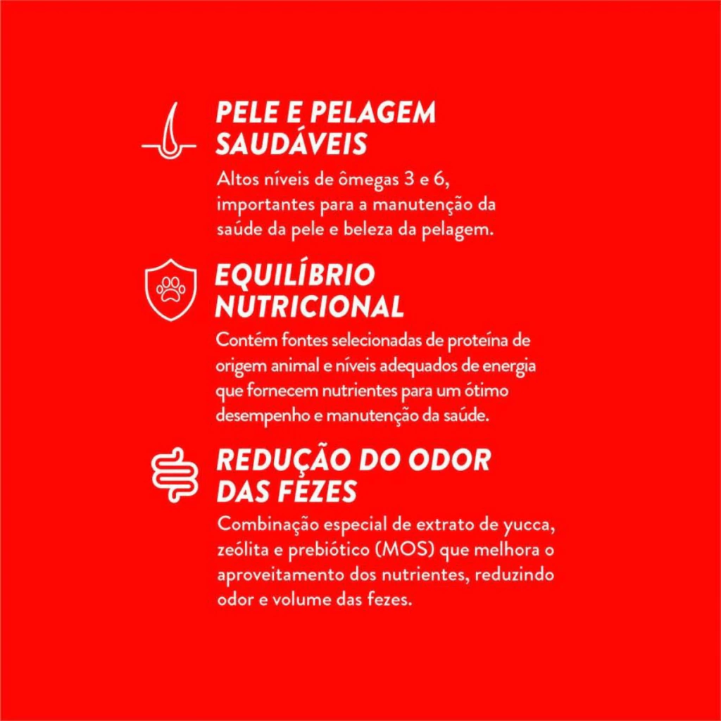 Contém fontes selecionadas de proteína de origem animal e níveis adequados de energia que fornecem nutrientes para um ótimo desempenho e manutenção da saúde.