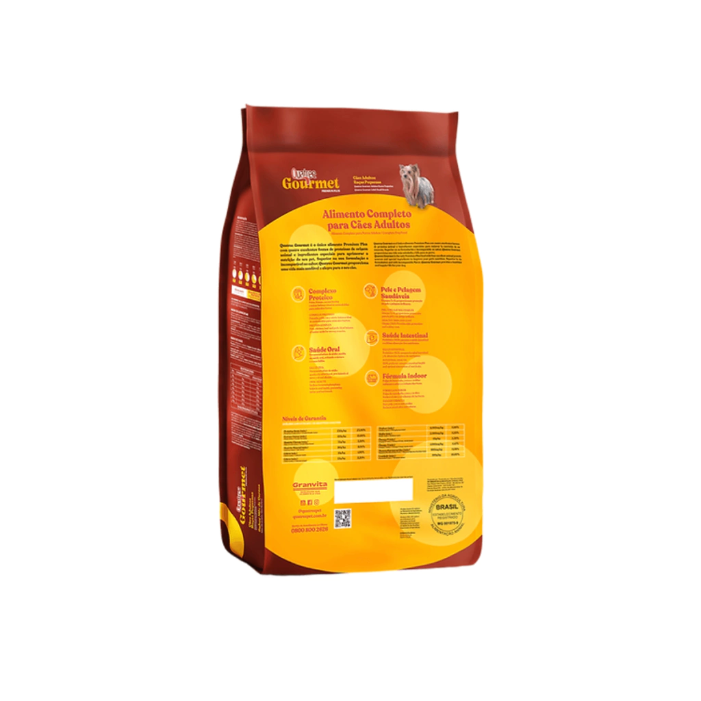 A Ração Seca Quatree Gourmet Cães Adultos Raças Pequenas é um alimento elaborado com matérias-primas selecionadas, que proporciona uma alimentação completa para o seu cão. Possui polpa de beterraba e prebiótico (MOS) para um ótimo equilíbrio intestinal, e extrato de yucca, que auxilia na redução do odor das fezes. Fornece os ácidos graxos essenciais ômegas 3 e 6, importantes para manter a pelagem bonita e a pele saudável. Contém hexametafosfato de sódio, ingrediente que contribui para a prevenção da formação do tártaro. Quatree Gourmet Adultos Raças Pequenas é um alimento Premium balanceado e saboroso para o seu companheiro.