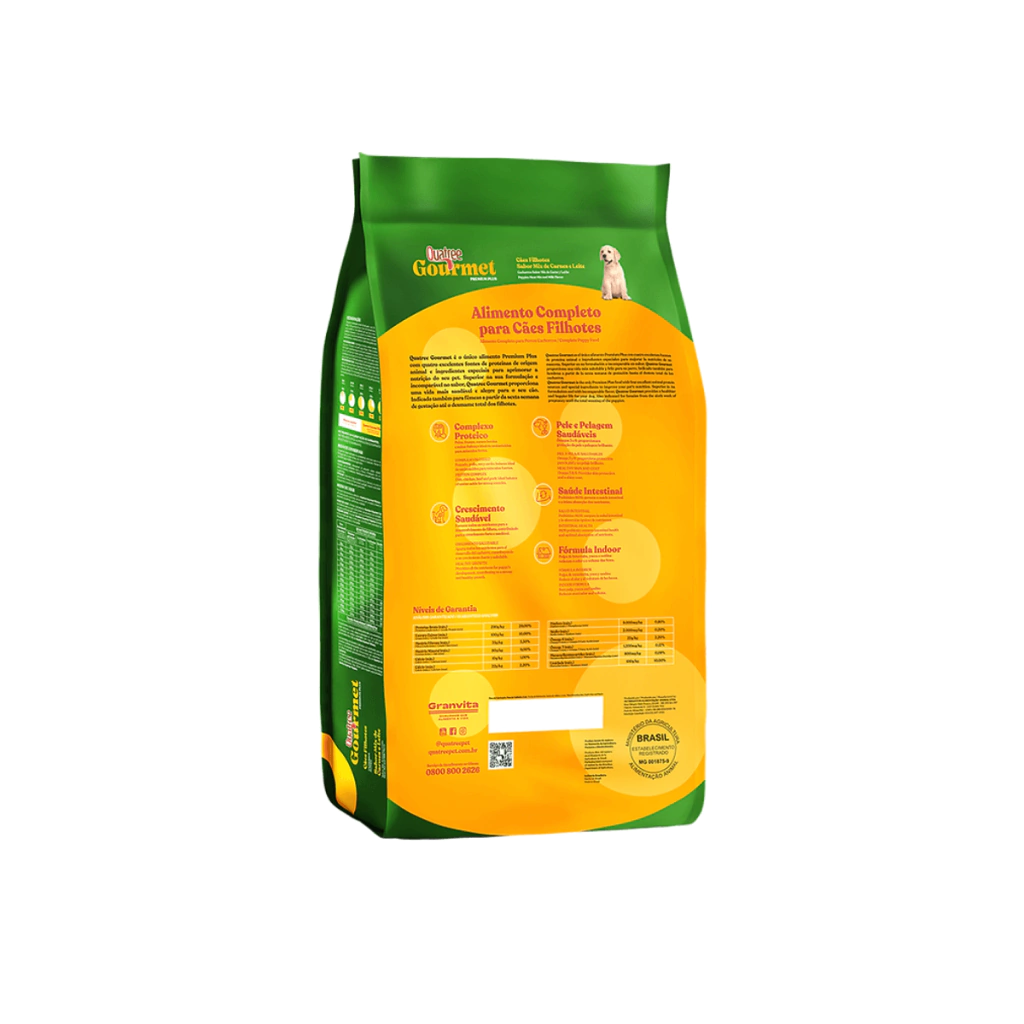 A Ração Seca Quatree Gourmet Cães Filhotes é um alimento elaborado com matérias-primas nobres para fornecer uma alimentação completa e perfeito desenvolvimento do seu cão filhote. A seleção de excelentes fontes de proteína garante um crescimento forte e saudável. Reúne em sua fórmula fibras naturais: prebiótico (MOS) e polpa de beterraba, para melhorar as defesas do organismo e promover a saúde intestinal. Quatree Gourmet Filhotes é um alimento completo e saboroso, rico em vitaminas e minerais, que proporcionará uma nutrição equilibrada. Possui também leite em pó integral, fonte nutrientes importante para a fase mais importante da vida dos filhotes. Indicado também para fêmeas a partir da sexta semana de gestação até o desmame total dos filhotes