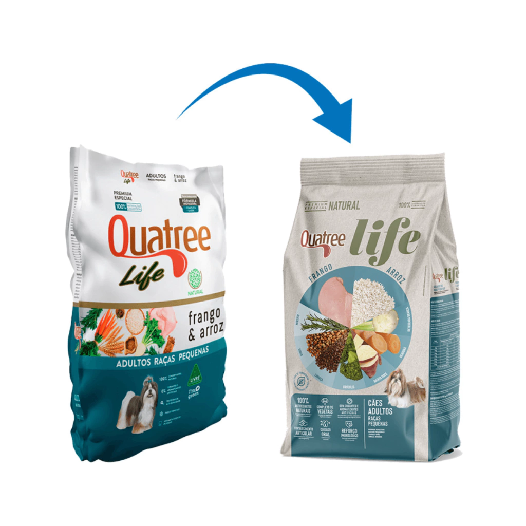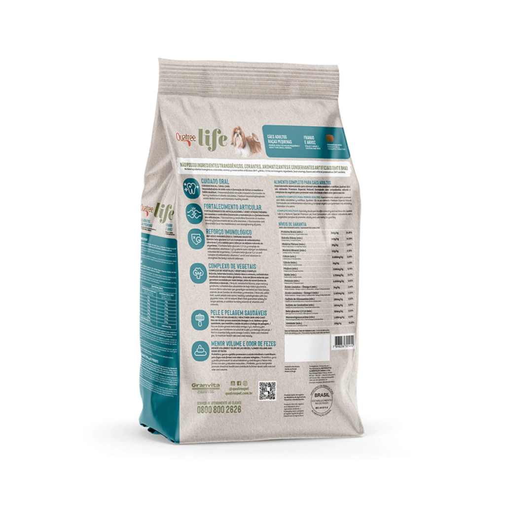 Especialmente desenvolvido para oferecer uma dieta saudável e nutritiva, Ração Seca Quatree Life Frango e Arroz Cães Adultos Raças Pequenas é um alimento Premium Especial Natural formulado com antioxidantes naturais e complexo de vegetais para promover mais vitalidade e bem-estar para o seu cão. Não possui ingredientes transgênicos, corantes, aromatizantes e conservantes artificiais (BHT e BHA).