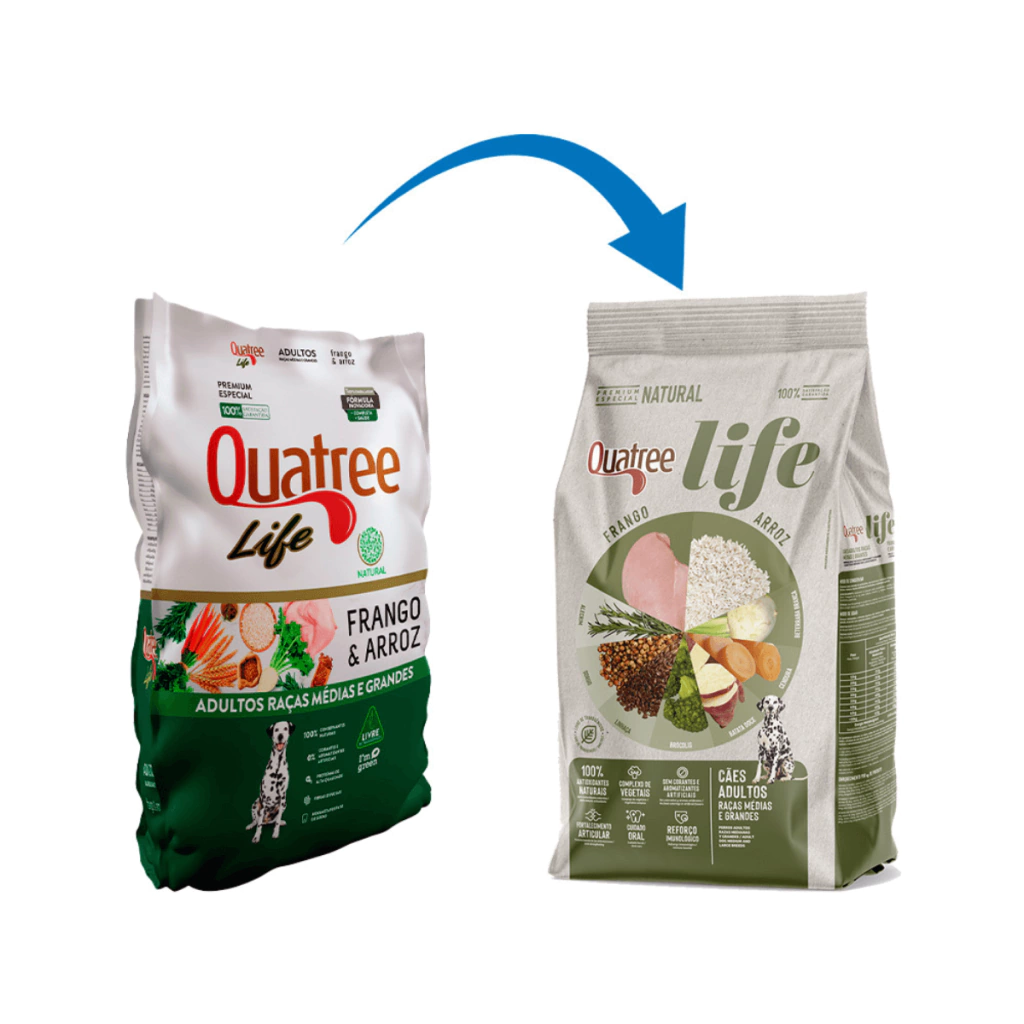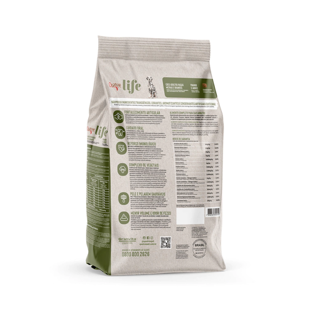 Especialmente desenvolvido para oferecer uma dieta saudável e nutritiva, Ração Seca Quatree Life Frango e Arroz Cães Adultos Raças Médias e Grandes é um alimento Premium Especial Natural formulado com antioxidantes naturais e complexo de vegetais para promover mais vitalidade e bem-estar para o seu cão. Não possui ingredientes transgênicos, corantes, aromatizantes e conservantes artificiais (BHT e BHA).