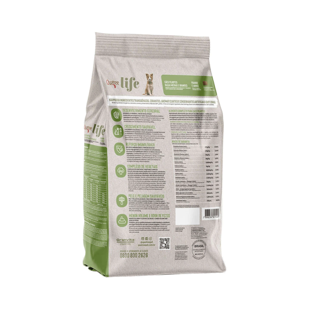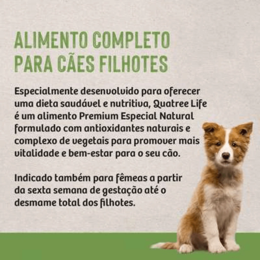 Especialmente desenvolvido para oferecer uma dieta saudável e nutritiva, Ração Seca Quatree Life Frango e Arroz Cães Filhotes Raças Médias e Grandes é um alimento Premium Especial Natural formulado com antioxidantes naturais e complexo de vegetais para promover mais vitalidade e bem-estar para o seu cão. Indicado também para fêmeas a partir da sexta semana de gestação até o desmame total dos filhotes. Não possui ingredientes transgênicos, corantes, aromatizantes e conservantes artificiais (BHT e BHA).