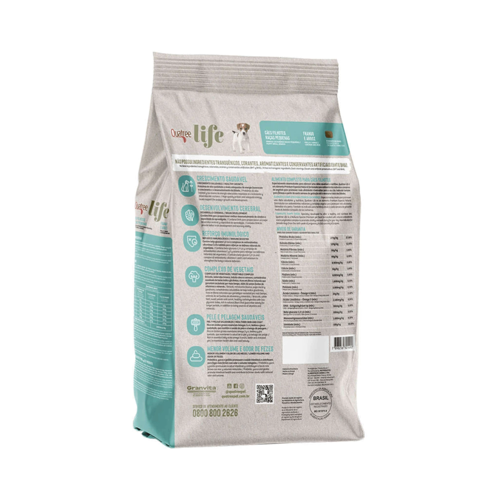 Especialmente desenvolvido para oferecer uma dieta saudável e nutritiva, Ração Seca Quatree Life Frango e Arroz Cães Filhotes Raças Pequenas é um alimento Premium Especial Natural formulado com antioxidantes naturais e complexo de vegetais para promover mais vitalidade e bem-estar para o seu cão. Indicado também para fêmeas a partir da sexta semana de gestação até o desmame total dos filhotes. Não possui ingredientes transgênicos, corantes, aromatizantes e conservantes artificiais (BHT e BHA).