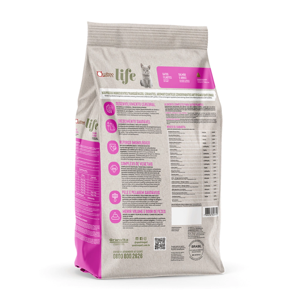 Quatree Life Gatos Filhotes foi especialmente desenvolvido para oferecer uma dieta saudável e nutritiva. Quatree Life é um alimento Premium Especial Natural formulado com antioxidantes naturais e complexo de vegetais para promover mais vitalidade e bem-estar para o seu gato. Indicado também para fêmeas durante o período de gestação até o desmame total dos filhotes. Não possui ingredientes transgênicos, corantes, aromatizantes e conservantes artificiais (BHT e BHA).